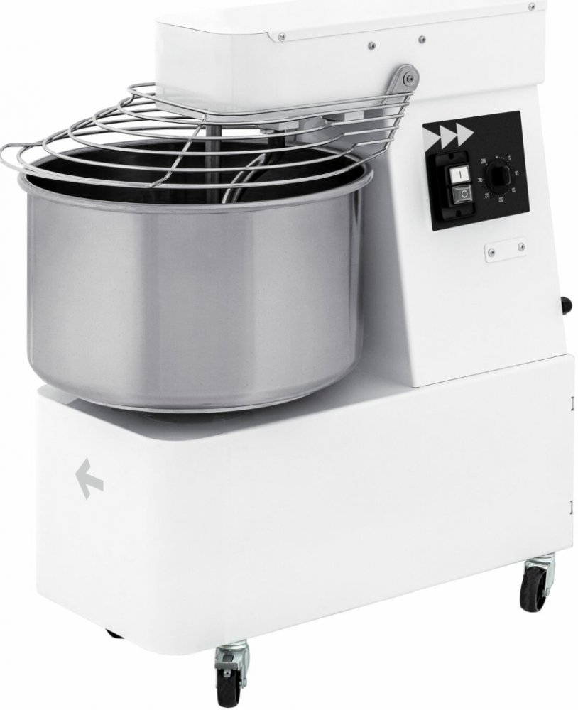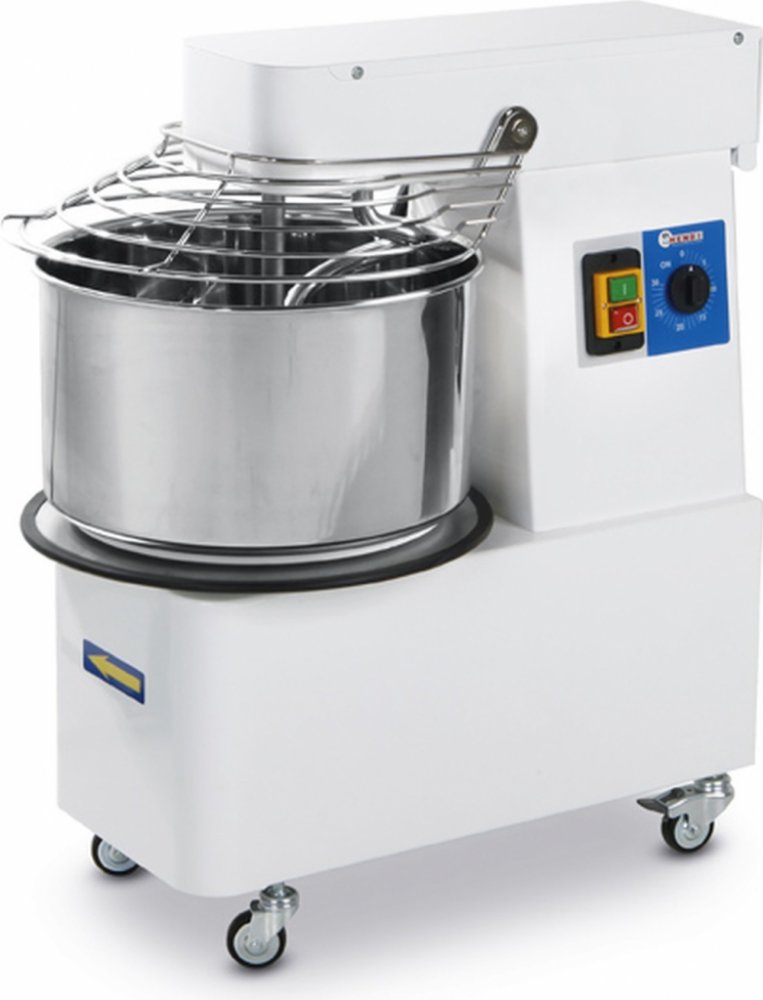 Pro profesionální použitíIdeální pro pizzerie, pekárny, cukrárny, výrobny koláčů a koblih k hnětení těžkých těst.Pevný a robustní kryt z bíle lakované oceliMiska, bezpečnostní kryt, spirála z nerezové oceli AISI 304Pevná mísa a hlava - jednoduchá, osvědčená konstrukceBezpečnostní kryt mřížky usnadňuje přidávání přísad během provozuMikrospínač zastaví stroj při otevření bezpečnostního krytuŘetězový pohon pro efektivní provozZaručeně tichý provoz díky převodovce s olejovou náplníVynikající homogenita těsta a provzdušněníNezahřívá těsto během provozuVestavěný 30minutový časovač4 kolečka, 2 s brzdou pro pohodlnou přepravu a snadné použití v kuchyni.Rozměry mísy (mm): ⌀360x (V)210