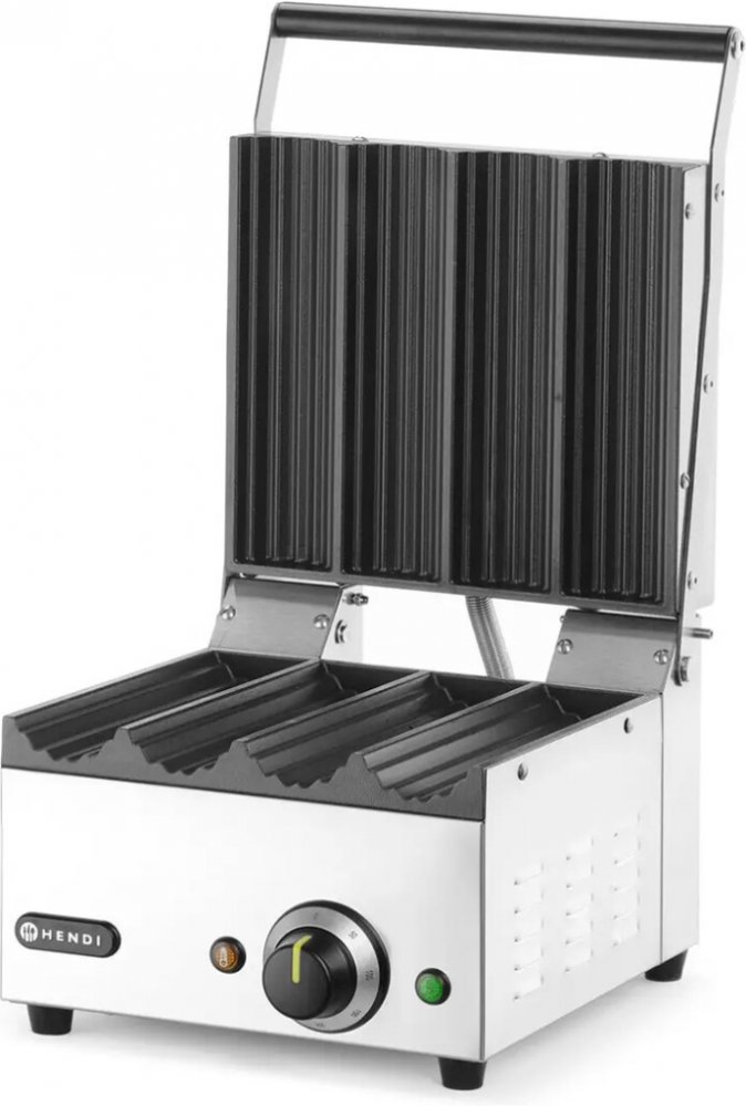 Kontaktní gril – Hotdogy – 1800 W – 385×285 mm | Hendi 263594 je profesionální kompaktní gril určený pro rychlé a rovnoměrné opékání hotdogových housek, baget a tortill. Čtyři tvarované pozice umožňují současnou přípravu více kusů pečiva, čímž šetří čas a zvyšují efektivitu práce. Robustní nerezový kryt a smaltované litinové desky posky...