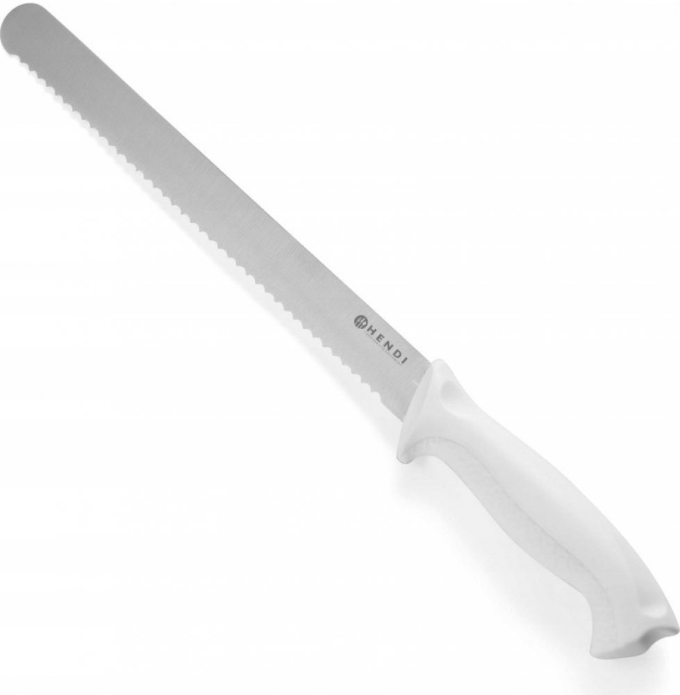 Profesionální nůž na pečivo a mléčné výrobky značky Hendi Charakteristická rukojeť v bílé barvě usnadňuje rozpoznání nože, díky čemuž je pro uživatele snazší postarat se o to, aby nepřišel do styku s alergeny.