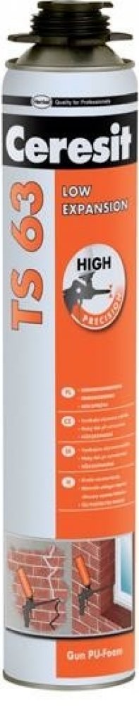 Ceresit TS 63 je jednosložková nízkoexpanzní pistolová polyuretanová pěna vytvrzující vzdušnou vlhkostí vhodná pro montáž zárubní, parapetů, prahů, okenních a dveřních rámů, vyplňování dutin, utěsňování otvorů ve střešních konstrukcích a izolačních materiálech, vytváření zvukotěsných stěn, vyplňování mezer okolo potrubí, fixace a izolování stěnových panelů, střešních tašek, atd.