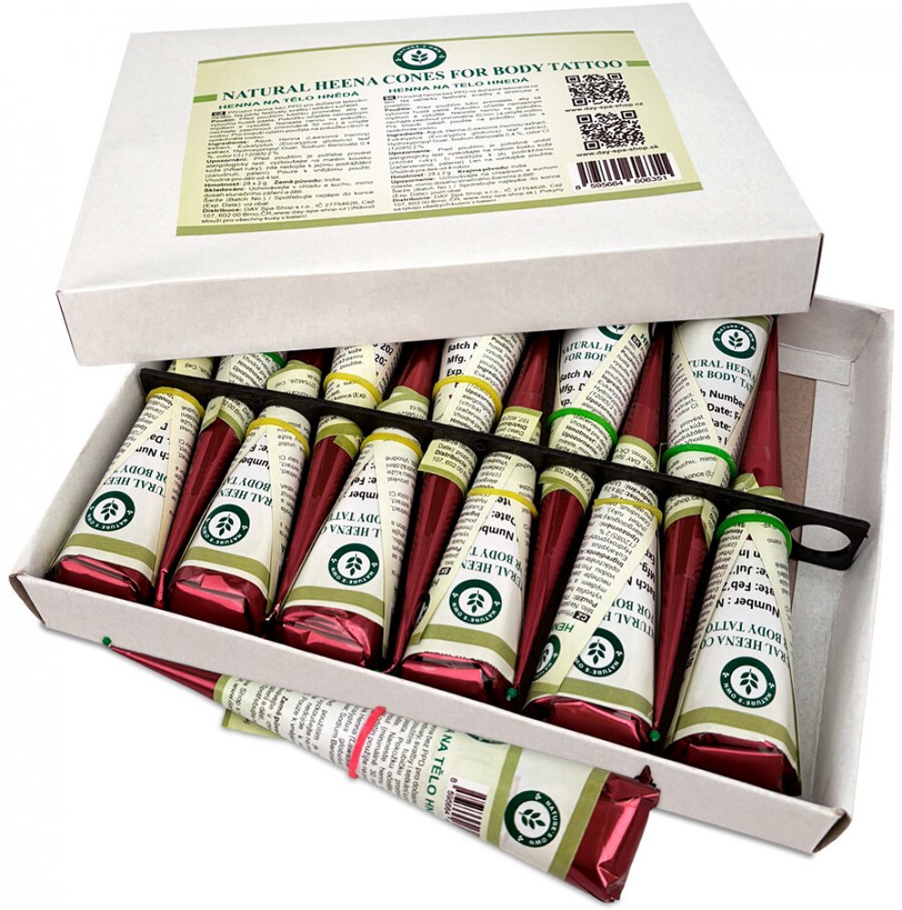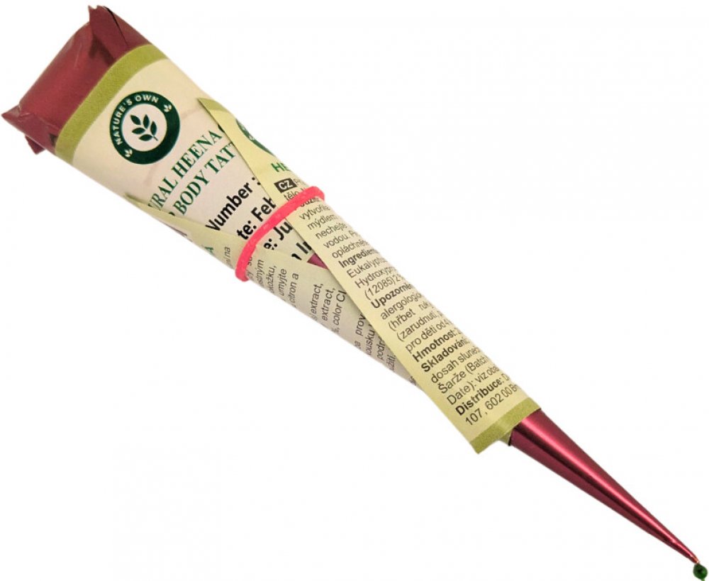Barva je tmavě hnědá s červeným nádechem. Oproti jiným hennám má trochu řidší konzistenci, není proto potřeba na tubu příliš tlačit.Po zaschnutí a odstranění zůstane na pokožce nádherná tmavá mahagonová kresba, která vydrží přibližně 7 dní.Použití: Pokožku očistěte nemastným mýdlem a vysušte. Naneste hennu na pokožku, nechejte zaschnout (minimálně 30 min.) a umyjte vodou.Složení: Aqua, Henna (Lawsonia Intermis), Eukalyptus (Eucalyptus globulus) leaf extract, Hydroxypropyl guar, barvivo CI 12085, Sodium Benzoate 0,4 %Upozornění: Před použitím je potřeba provést alergologický test: vyzkoušejte na malém kousku kůže (hřbet ruky), zda nedojde k jejímu podráždění (zarudnutí, pálení). Pouze k vnějšímu použití.Skladování: Uchovávejte na chladném a suchém místě, mimo dosah slunečního záření a dětí.Hmotnost 1 kornoutu: 28 ± 2 gZemě původu: Indie