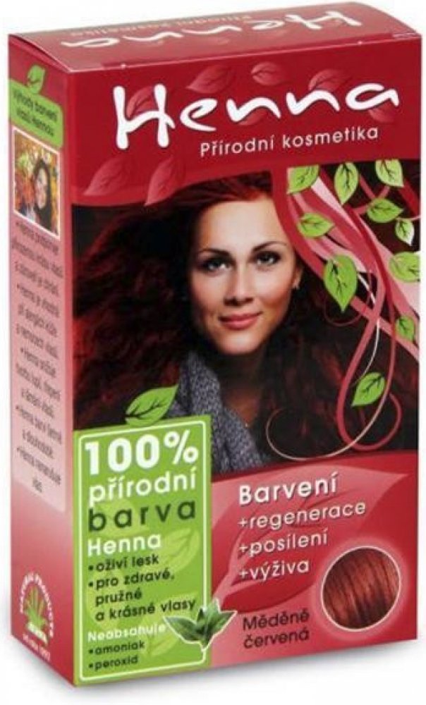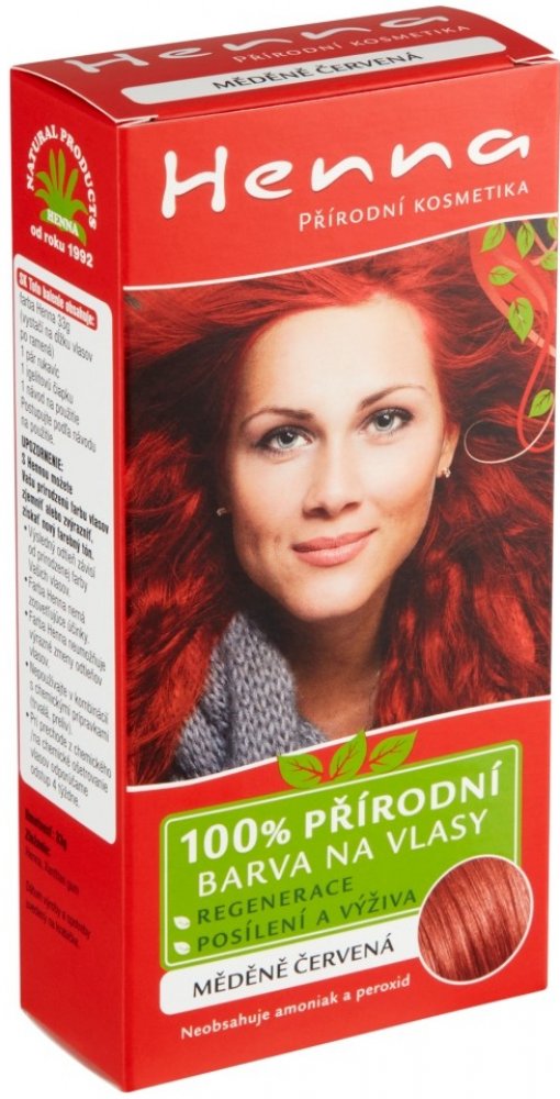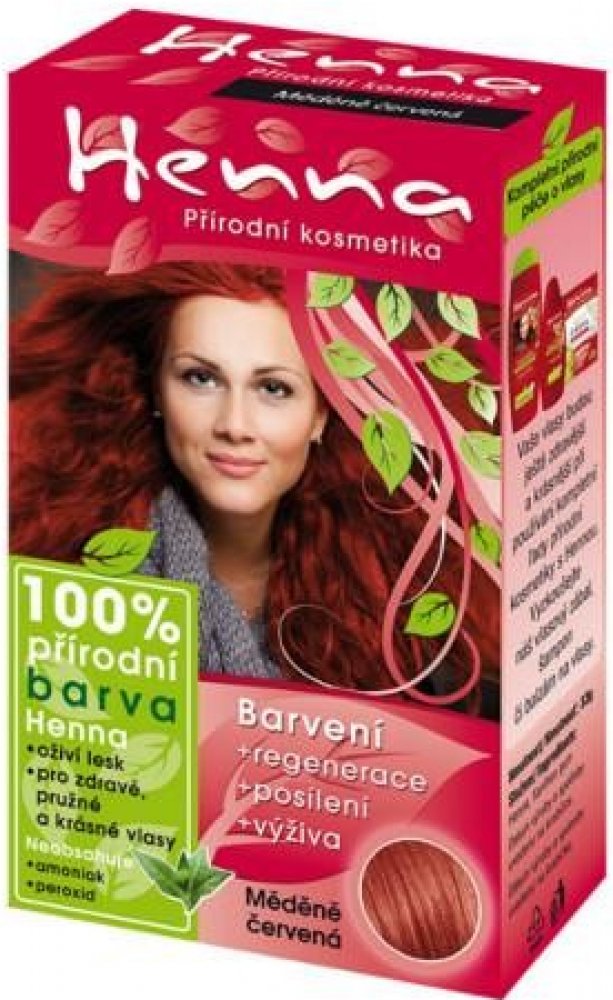 Henna přírodní barva na vlasy měděně červená 33g Kosmetika Henna je přírodní kosmetický program založený na produktech z henny s vysokým obsahem rostlinných proteinů. Barvy jsou přírodní a mají regenerační a léčivé účinky na vlasy i pokožku hlavy. Dodávají vlasům potřebné vitamíny, regenerují a posilují vlasové kořínky.