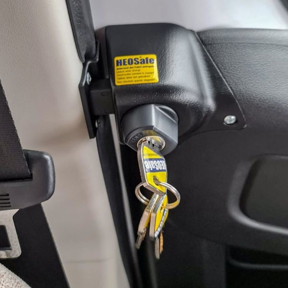 Zajištění kabiny před neoprávněným otevřenímVnitřní přídavný zámek HEOSafe zajistí kabinu před neoprávněným otevřením a vniknutím. Vysunutí petlice se provádí otočným knoflíkem. Zámek může být uzamčen v poloze vysunuté i zasunuté petlice. Je vyroben z odolného hliníkového tlakového odlitku.Vnitřní zámek dveří HEOSafe pro Fiat Ducato se instaluje na kliku dveří nebo loketní opěrku. Samotná instalac...