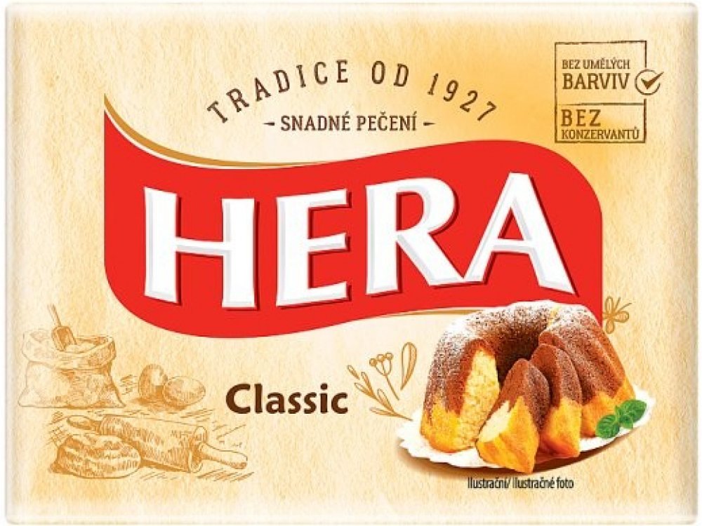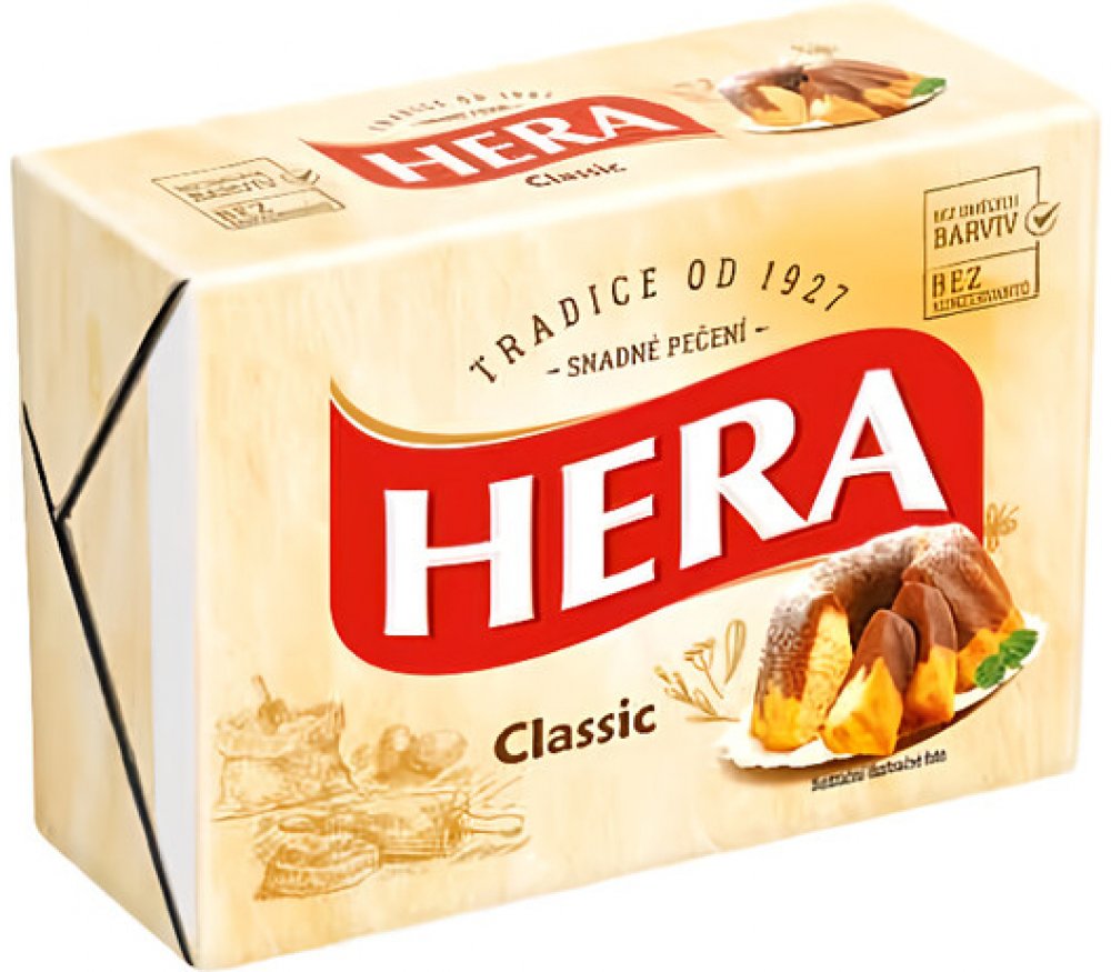 -- Hera je tu pro vás ve dvou variantách. Klasická Hera je vynikající na jakékoli pečení. Obsahuje 72% tuku. Lze s ní snadno pracovat ihned po vytažení z lednice a zaručuje krásně vláčné těsto.