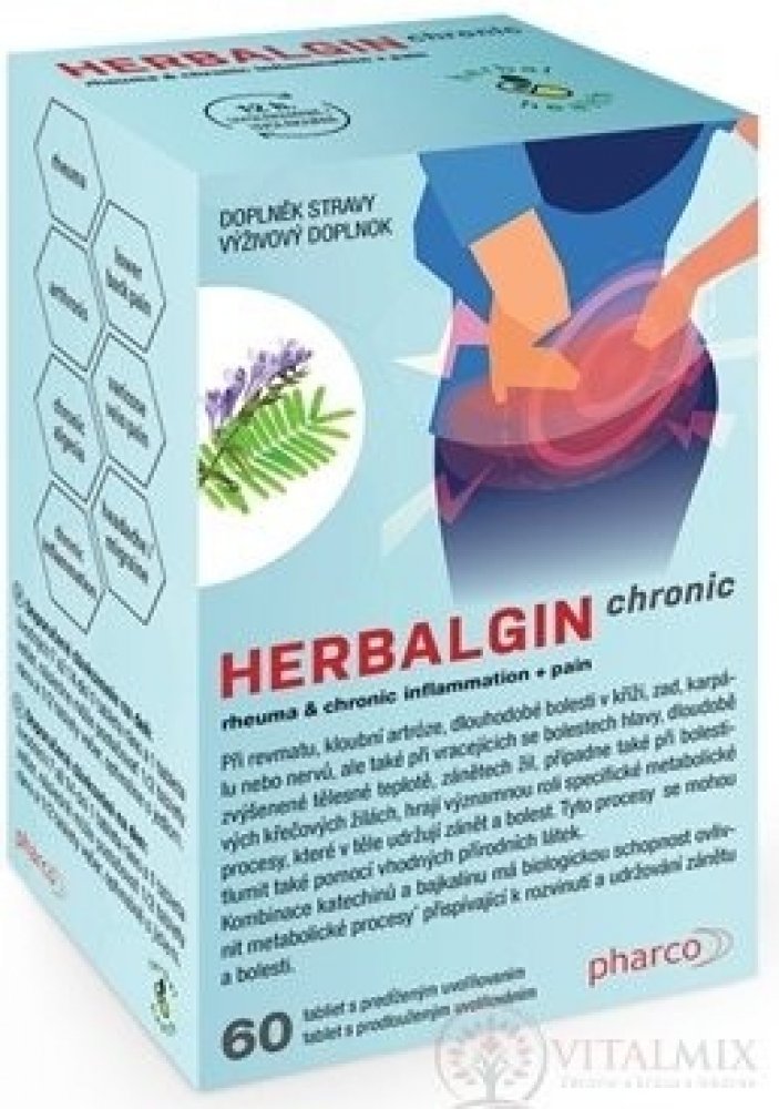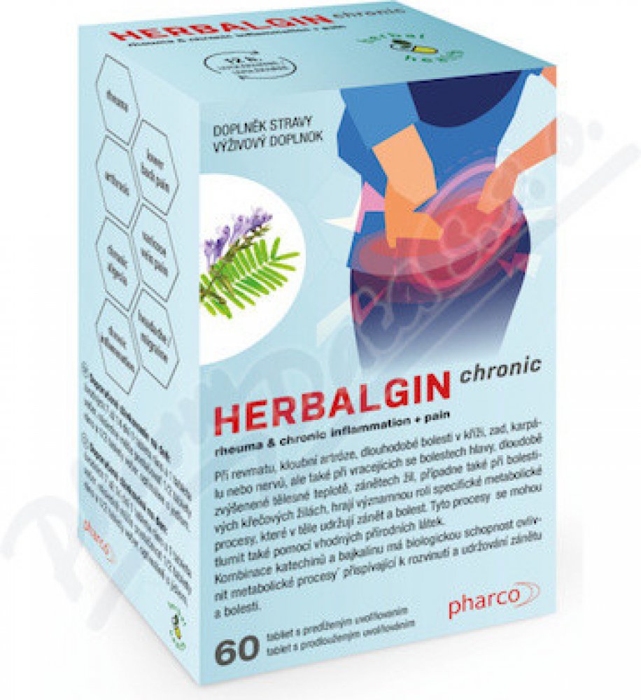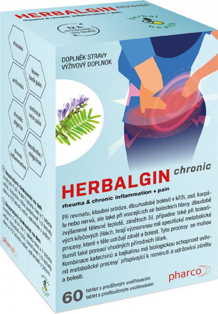 pharco HERBALGIN chronic obsahuje originální bylinnou směs třapatky a akácie v tabletách s postupným uvolňováním. Je vhodný pro osoby s dlouhodobými záněty v těle, revmatismem, artritidou kloubů nebo karpálního tunelu, dlouhodobými bolestmi zad a kříže, dlouhodobými bolestmi nebo záněty nervů, dlouhodobými střevními záněty, dlouhodobými záněty průdušek (např. astma), hemoroidy, křečovými žilami ne...