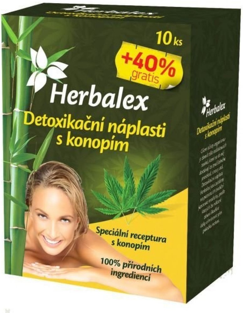 Detoxikační náplasti na očistu organismu. Speciální receptura s konopím. Detoxikační náplasti Herbalex jsou vhodným prostředkem k detoxikaci a posílení imunitního systému neinvazivní cestou. Mají 100% přírodní složení. Cílem očisty organismu je zbavit tělo nežádoucích toxinů, které se do něj dostávají ze znečištěného prostředí, stravy atd. Detoxikační náplasti s konopím jsou založeny na poznatcích tradiční japonské medicíny, podle kterých lze některé zdraví škodlivé látky eliminovat přes pokožku nohou. Pomáhají odstraňovat škodliviny z těla, při únavě, bolestech kloubů, hlavy a kožních vyrážkách, podporují klidný spánek, zlepšení funkce metabolismu.