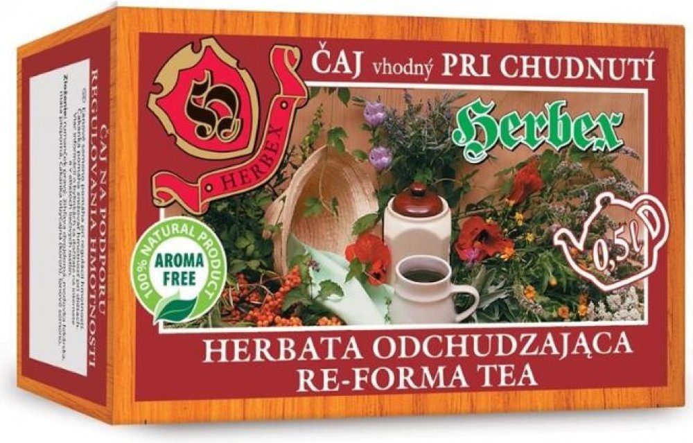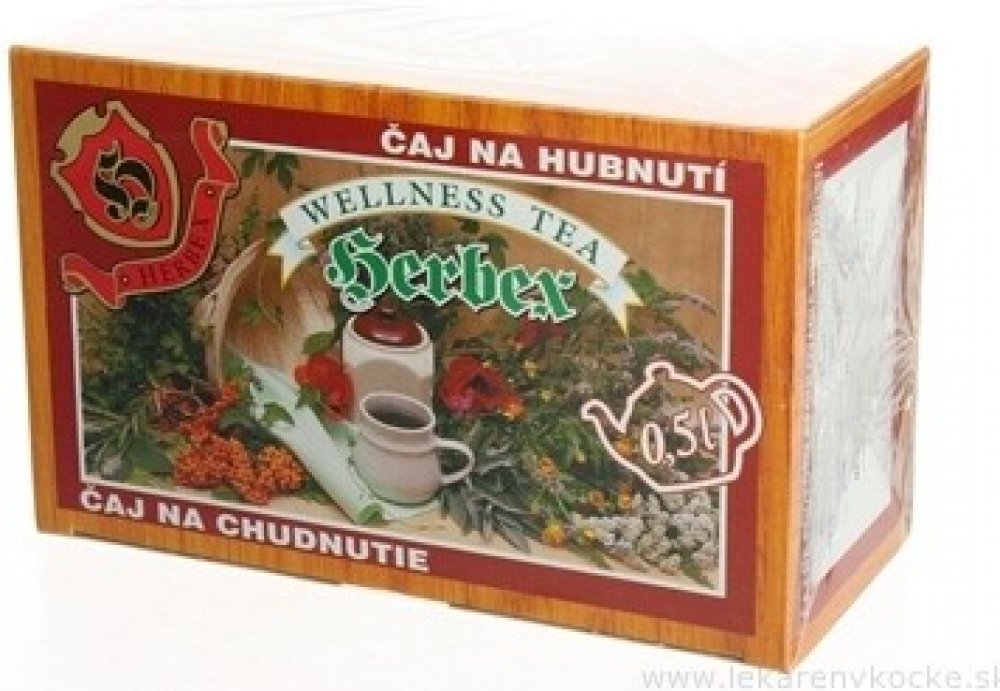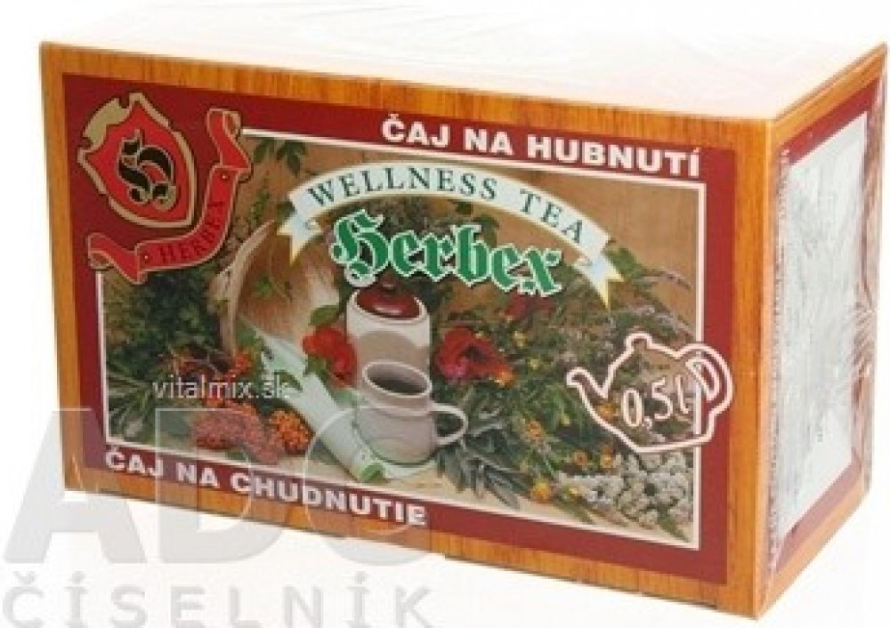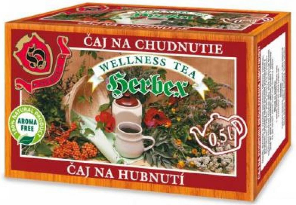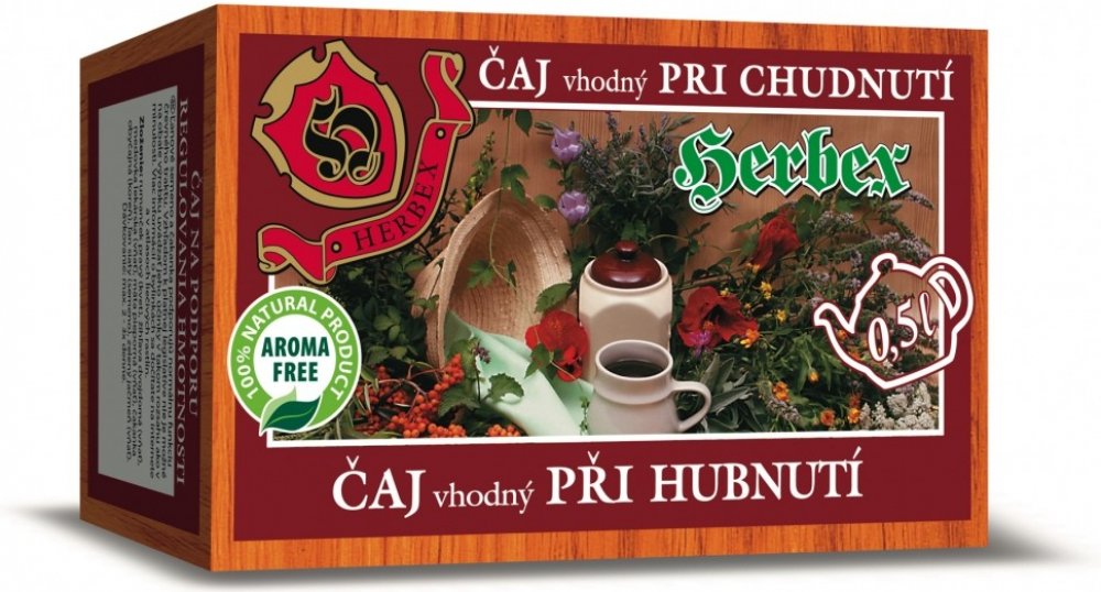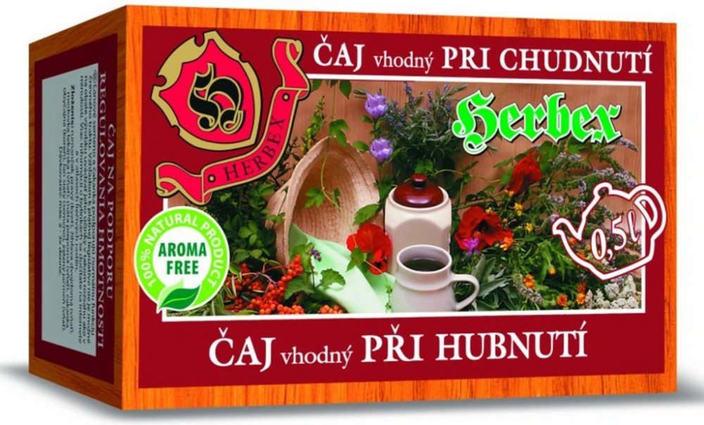 Herbex Čaj na hubnutí je směsný čaj s obsahem heřmánku, kopřivy, máty, meduňky, čekanky a lnu. Heřmánek přispívá k normálnímu trávení. Kopřiva podporuje normální činnost ledvin a přispívá k vylučování vody z organismu. Meduňka přispívá k normálnímu trávení. Máta podporuje normální činnost trávicí soustavy a střev. Čekanka podporuje normální funkci střevního traktu, kontrolu tělesné hmotnosti - ovlivňuje chuť k jídlu a přispívá k vylučování - pročištění těla. Len přispívá ke kontrole tělesné hmotnosti a k normální funkci střevního traktu. Balení obsahuje 20 nálevových sáčků o váze 3 g.
