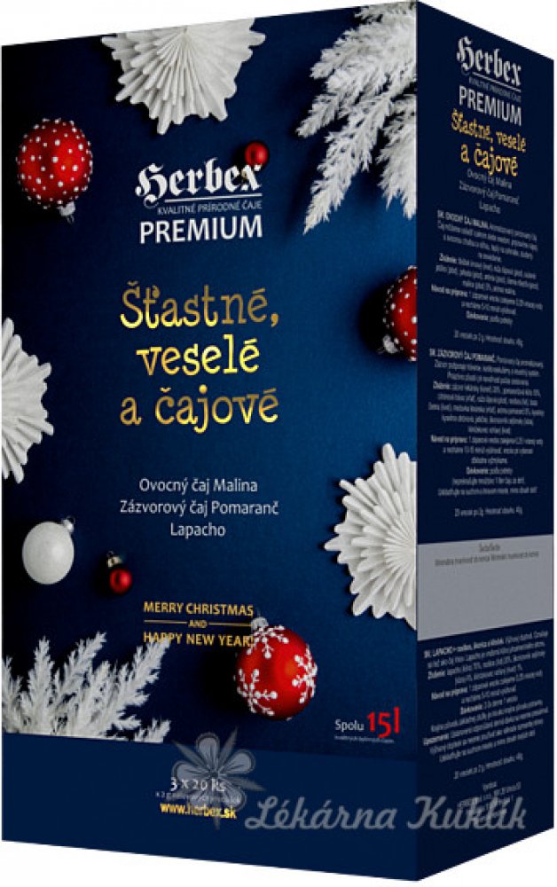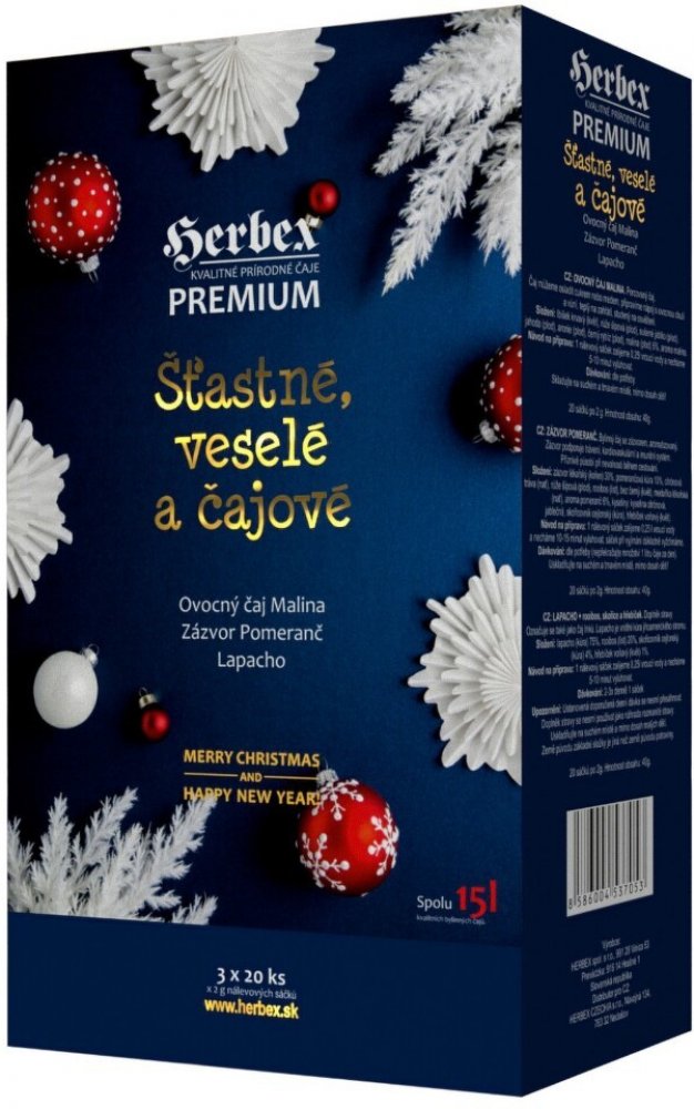 Vánoční balení čajů je složeno ze tří oblíbených zimních chuťovek Herbex premium rady Vánoční balení čajů Šťastné, veselé a čajové je složeno ze tří oblíbených zimních chuťovek Herbex premium rady.