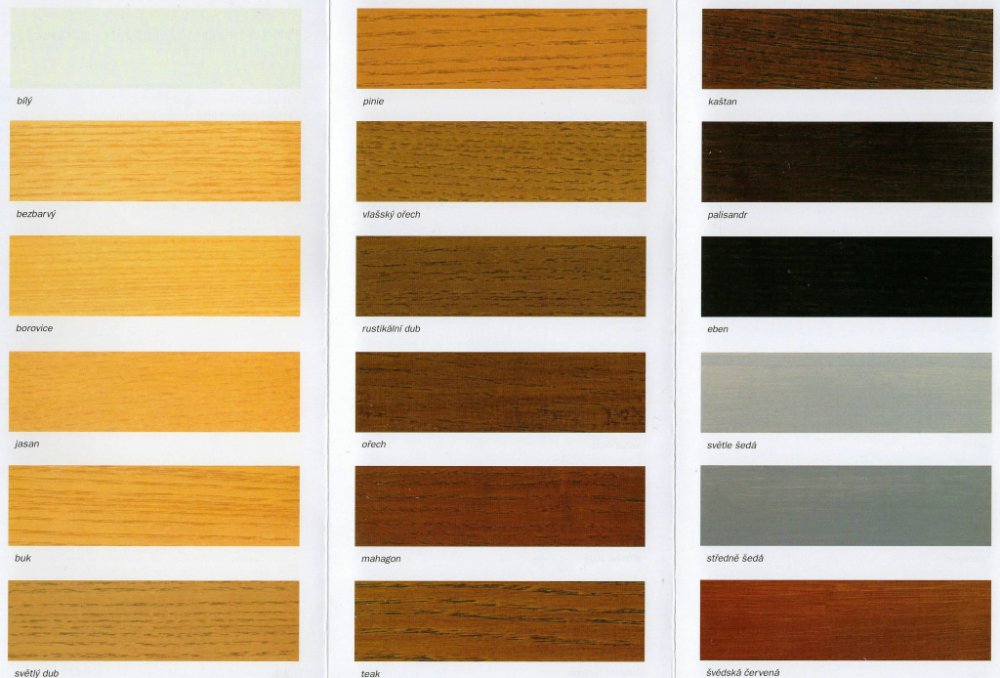 Barevné odstíny: 15 přírodních odstínů (hotové): bílý 0301, bezbarvý 0450, borovice 1200, jasan 1420, buk 1300, světlý dub 1401, pinie 1400, vlašský ořech 8404, rustikalní dub 1402, ořech 8405, mahagon 8407, teak 8406, kaštan 8408, palisandr 8409, eben 9410. Barevné odstíny se míchají na automatu Herbol-Color-Service v dalších desítkách odstínů podle přání zákazníků.