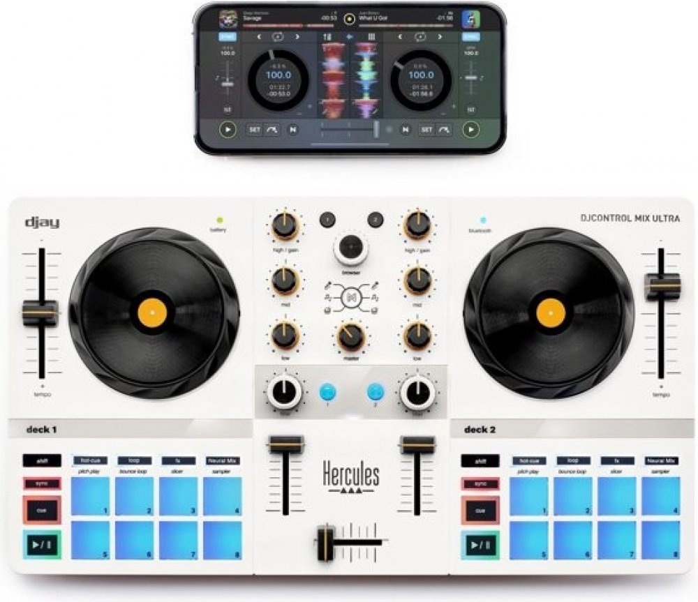Hercules DJControl Mix Ultra je DJ kontroler se dvěma virtuálními decky a mixážním pultem uprostřed. Tělo zařízení má bílé provedení s barevnými tlačítky a černými decky. Díky kompaktním rozměrům se snadno přenáší – vejde se i do batohu. Mixážní pult je plně kompatibilní s chytrými telefony a tablety s OS Android a iOS pomocí Bluetooth připojení. Vestavěná Li-ion baterie zajišťuje až 10 hodin prov...