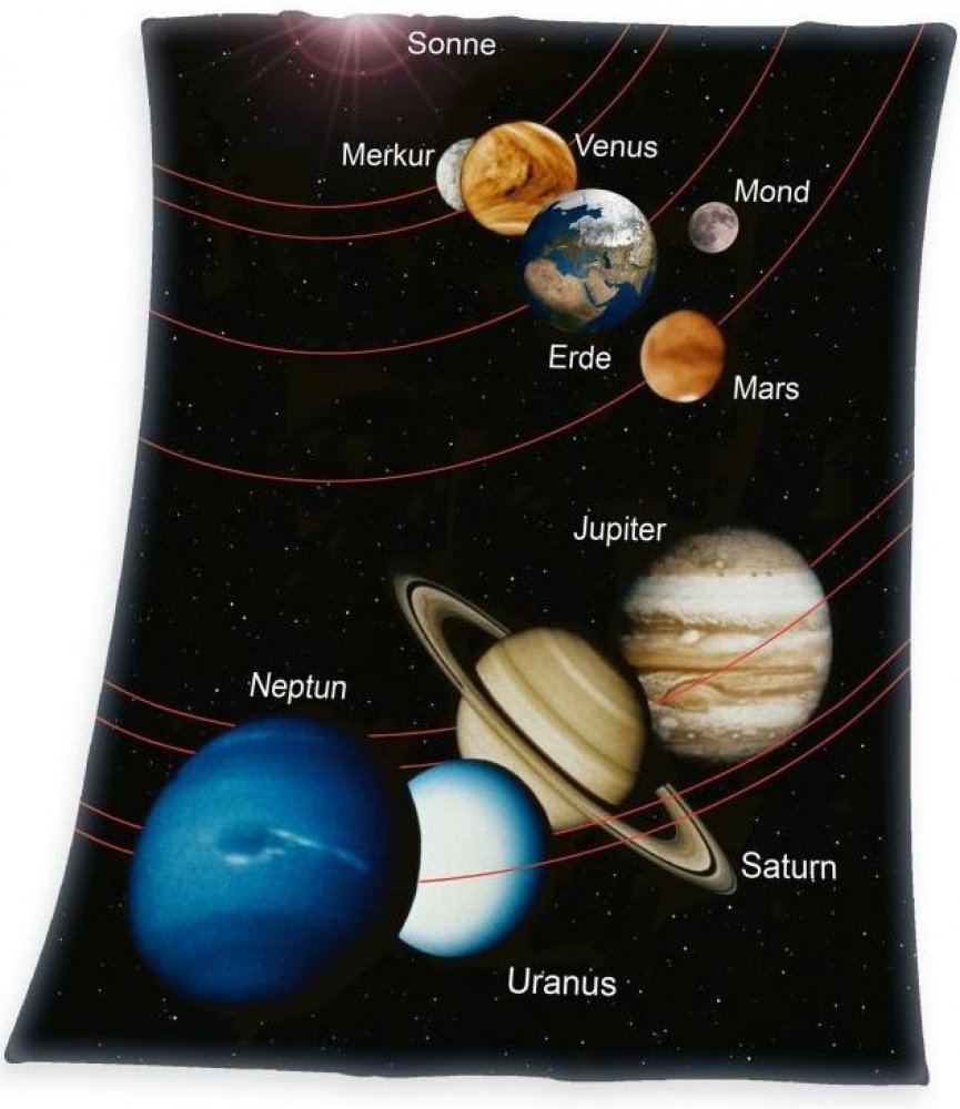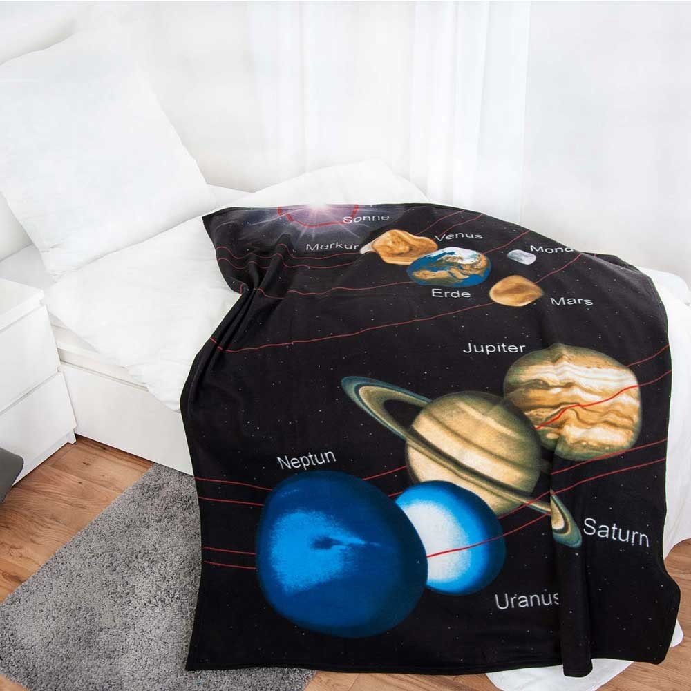 Co víc si můžete přát od fleese deky, než hebké a měkké pohlazení. Dětská flísová deka sluneční soustava je příjemná deka s krátkým chloupkem, který vás zahřeje v chladných dnech. Děti navíc potěší vizualizace sluneční soustavy a planet ve vzdálenosti od slunce - umíte je ještě vyjmenovat? (Merkur, Venuše, Země, Mars, Jupiter, Saturn, Uran, Neptun a Pluto už sem nepatří)A pokud doplníte postel ještě o dekorační polštář nebo lůžkoviny (sluneční soustava), pak bude pokojíček krásně sladěný a upravený. Deka je laděna do tmavých tónů. Použijte deku jako přehoz přes postel a proměňte dětský pokojíček v příjemné a útulné hnízdečko.