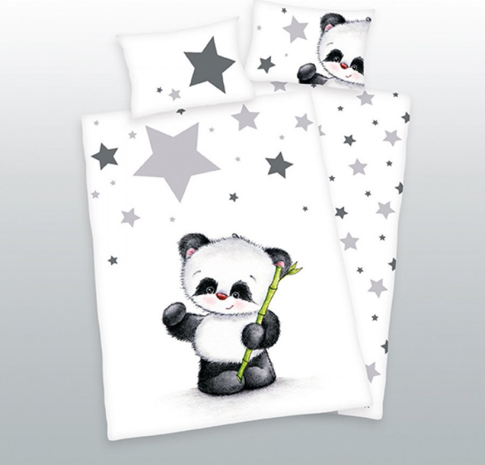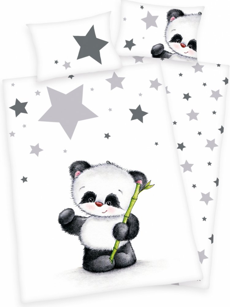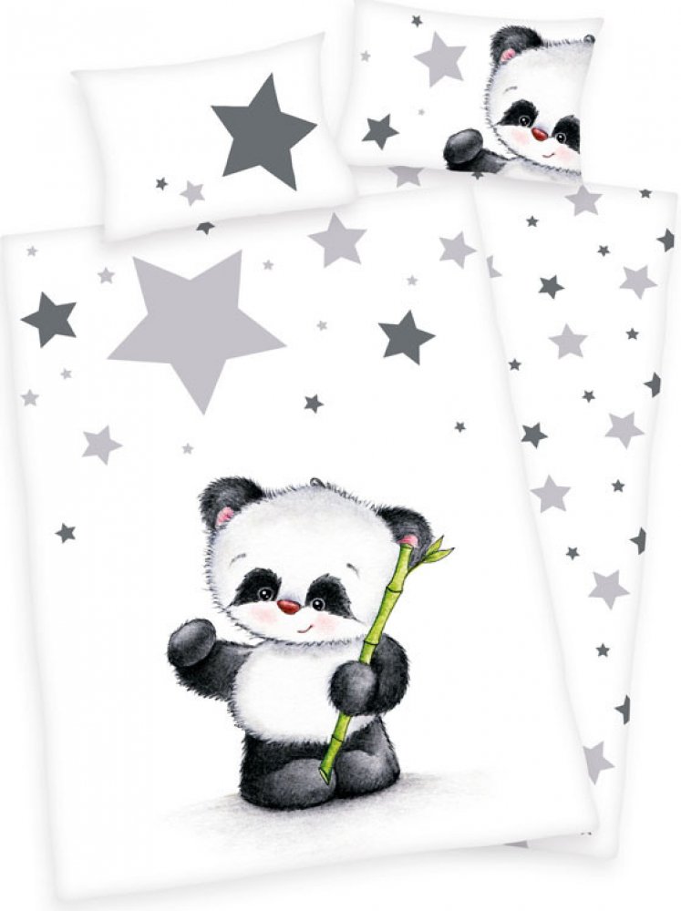 Postýlkové povlečení s pandou má z každé strany jiný motiv. Z přední strany najdete roztomilou pandu s bambusovým stonkem. Z druhé strany je bílý podklad s šedivými hvězdičkami. Polštář má z přední strany vyobrazený obličejík Pandího mláďátka a z druhé strany opět hvězdičky na bílém základu.