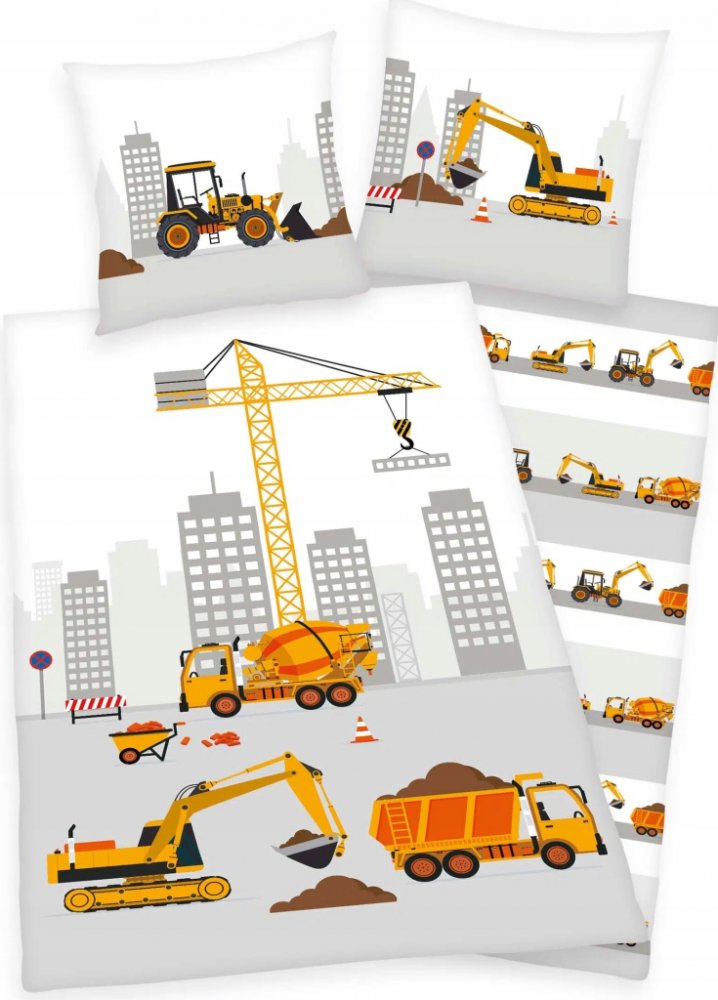 Bavlněné dětské povlečení má na přední straně obrázek jeřábu, míchačky, bagru a náklaďáku. Na zadní straně si může miminko prohlédnout autíček daleko více. Na polštáři napomůže s usínáním traktor nebo bagr se lžící.