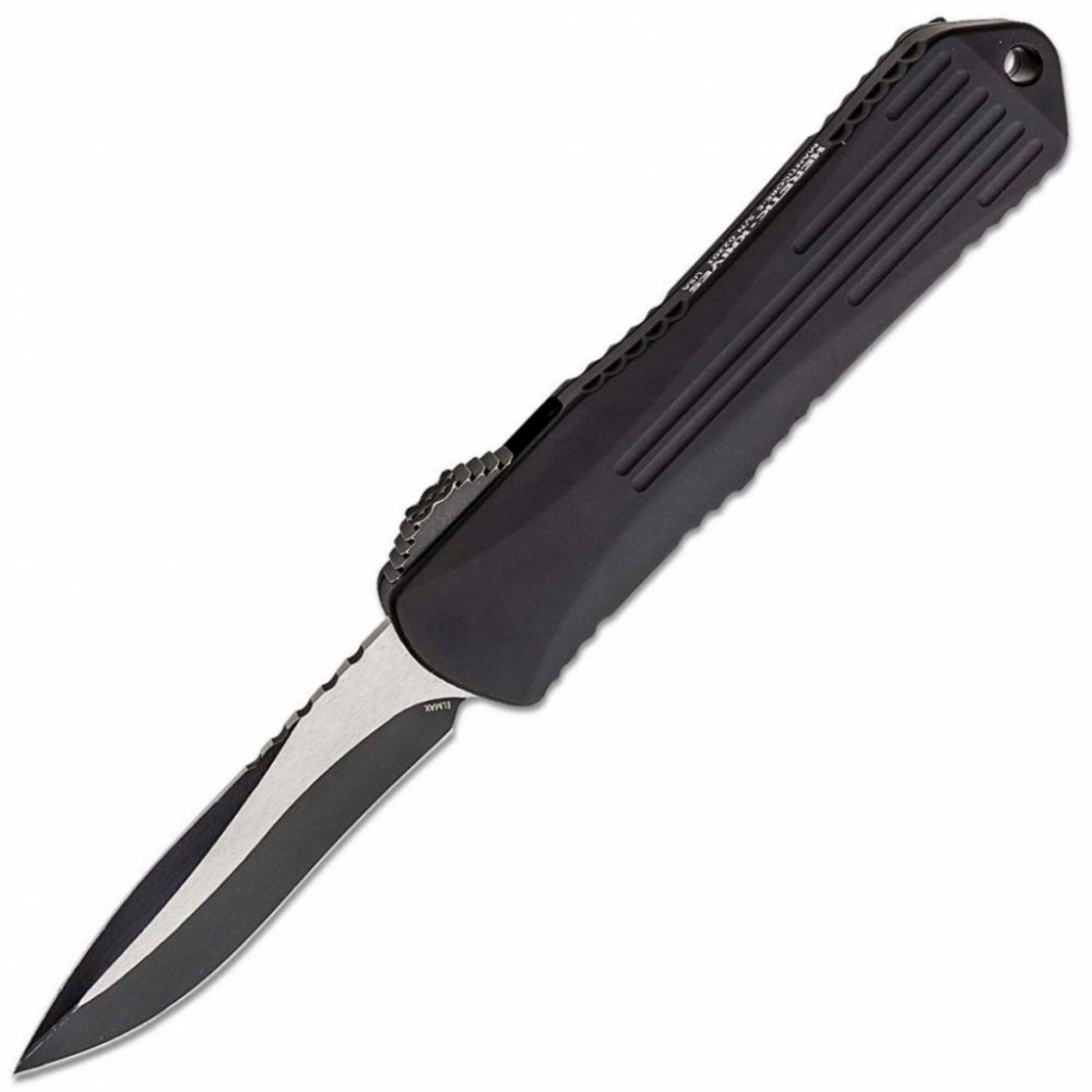 Vystřelovací Nůž Heretic Knives Manticore E OTF AUTO Knife Elmax Battleworn Two-Tone Recurve Blade, Black Aluminum Handles - H029-8A