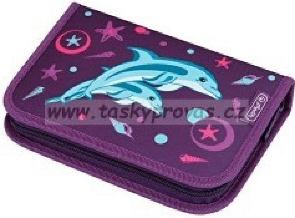 Jednopatrový vybavený penál s motivem delfínů. Penál má 2 chlopně a obsahuje 31 dílů - 14 fixů, 8 šestihranných pastelek, 2 tužky, ořezávátko, gumu, 16 cm pravítko, trojúhelník, kuličkové pero, rozvrh hodin a vizitku.