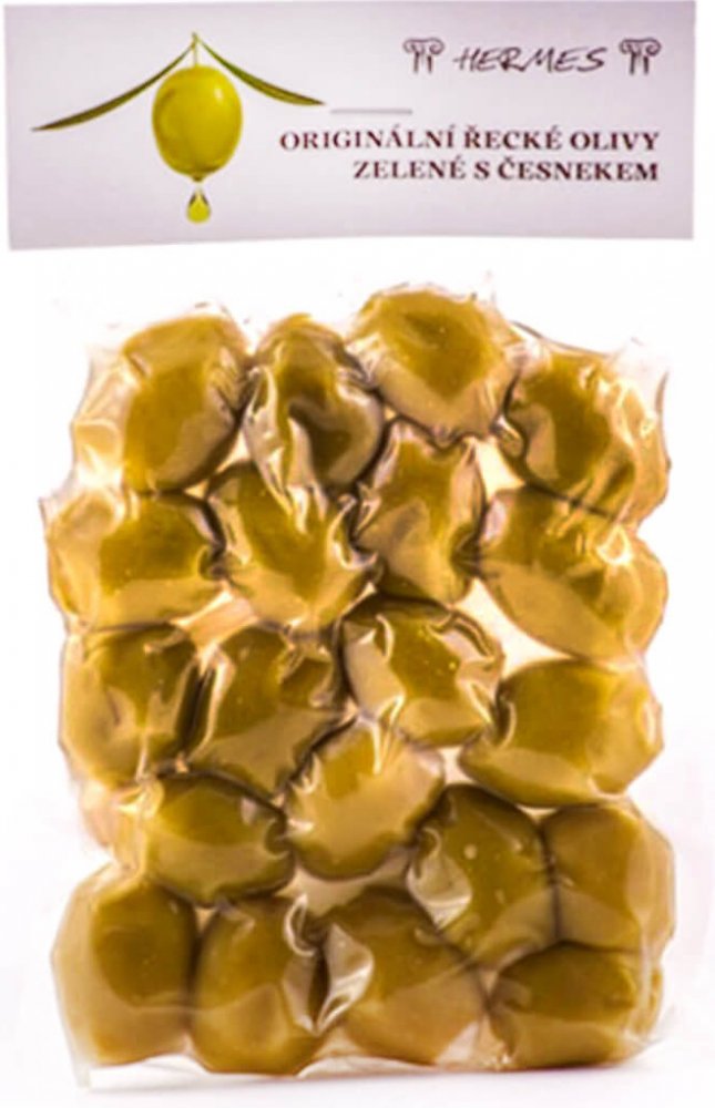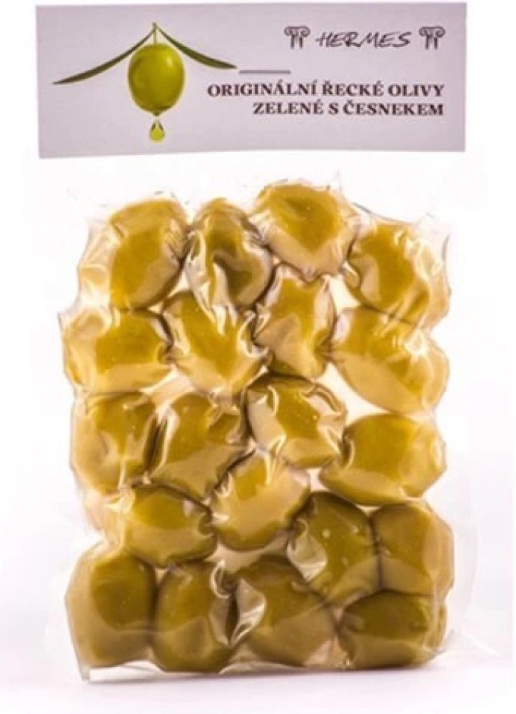 Charakteristika: vypeckované olivy plněné česnekem uskladněné ve vakuovém sáčku. Olivy jsou plněny ručně a jsou velmi delikátní.