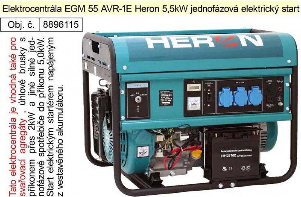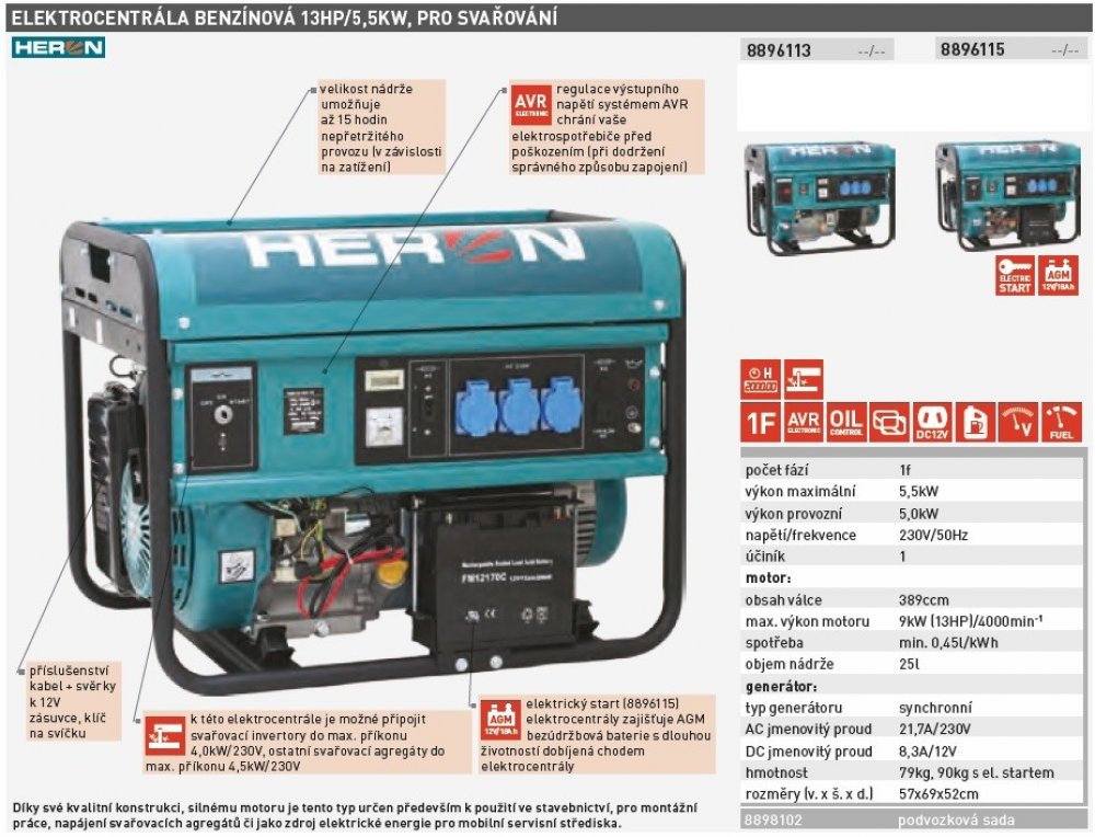Jedním z nejvýkonnějších generátorů Heron. Elektrocentrála je osazena osvědčeným motorem Heron s ventilovým rozvodem OHV. Elektrická část je vybavena AVR regulací výstupního napětí.