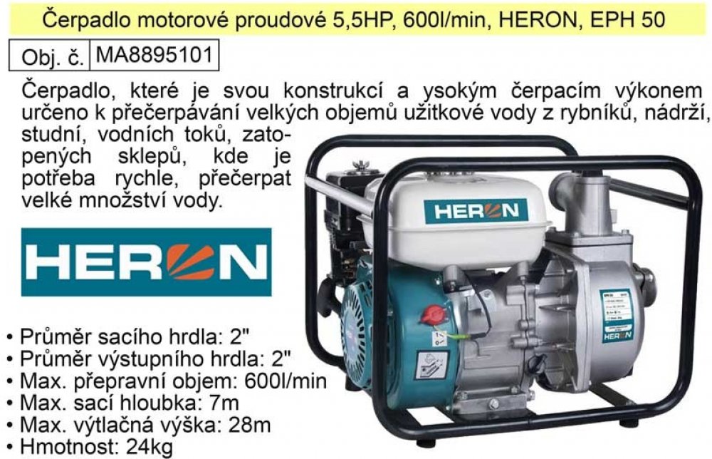 HERON 8895101 čerpadlo motorové proudové 5,5HP, 600l/min Čerpadlo, které je svou konstrukcí a vysokým čerpacím výkonem určeno k přečerpávání velkých objemů „čisté“ užitkové vody z rybníků, nádrží, studní, vodních toků a dalších podobných zdrojů, odčerpávání...