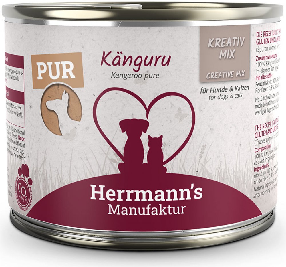 Klokaní maso 100 % (svalovina, plíce, srdce). Vařeno ve vlastní šťávě. Produkt může obsahovat drobné kousky kostí. Analytické složky: Vlhkost 80 % / Hrubý protein 10,9 % / Hrubý tuk 3,4 % / Hrubá vláknina 0,3 % / Hrubý popel 2,5 %. Konzervy jsou vyrobeny výhradně z komponentů nejvyšší potravinářské kvality, obsažené přísady pochází z kontrolovaného ekologického zemědělství. Zařazení dle legislativy: Doplňkové krmivo pro psy a kočky.