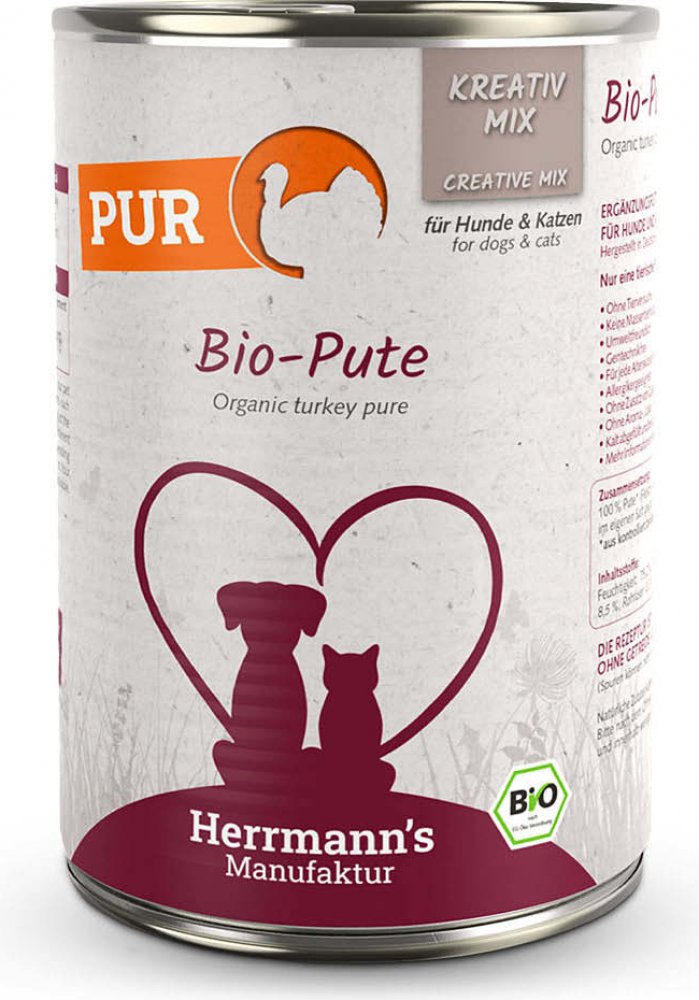 Bio krůtí maso 100 % (svalovina, droby, srdce, krky). Vařené ve vlastní šťávě. Analytické složky: Vlhkost 79,20 % / Hrubý protein 10 % / Hrubý tuk 8,5 % / Hrubá vláknina 0,3 % / Hrubý popel 2 %. Konzervy jsou vyrobeny výhradně z komponentů nejvyšší certifikované bio kvality, obsažené přísady pochází z kontrolovaného ekologického zemědělství. Zařazení dle legislativy: Doplňkové krmivo pro psy a kočky.