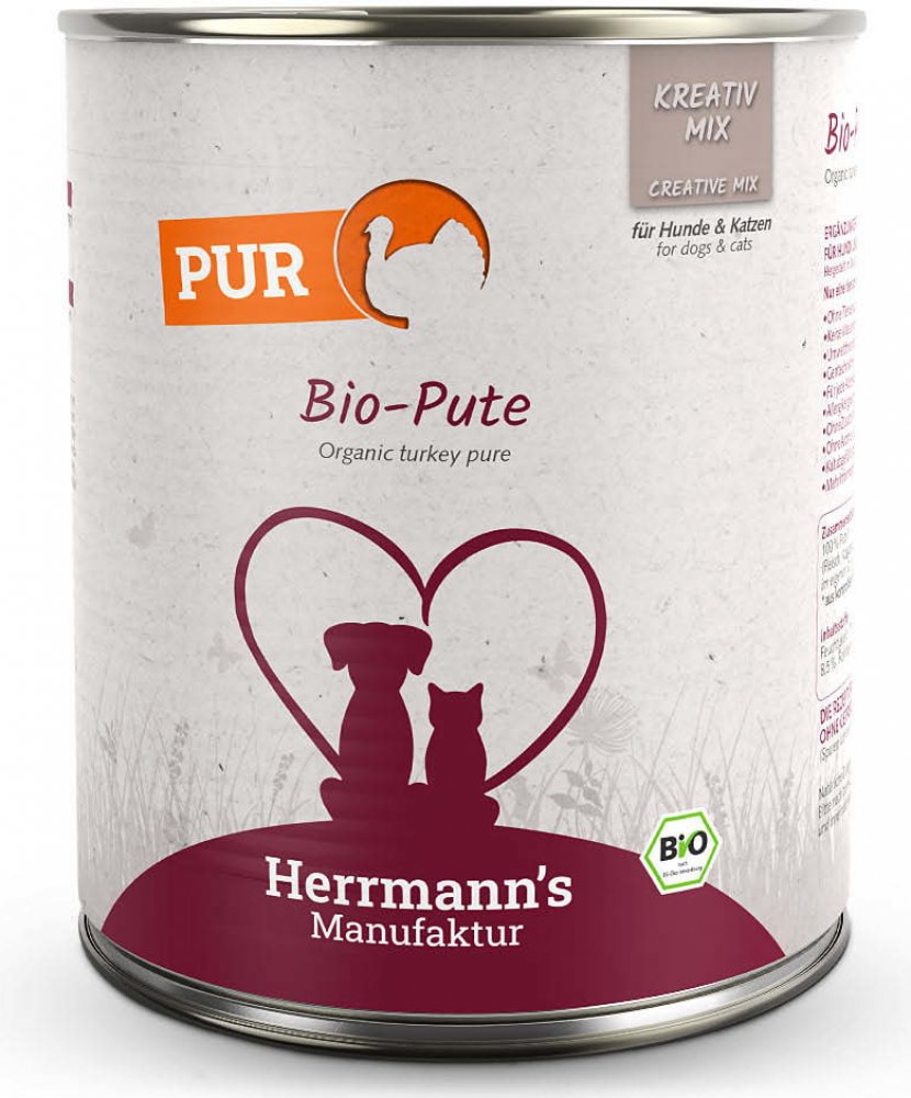 Bio krůtí maso 100 % (svalovina, droby, srdce, krky). Vařené ve vlastní šťávě. Analytické složky: Vlhkost 79,20 % / Hrubý protein 10 % / Hrubý tuk 8,5 % / Hrubá vláknina 0,3 % / Hrubý popel 2 %. Konzervy jsou vyrobeny výhradně z komponentů nejvyšší certifikované bio kvality, obsažené přísady pochází z kontrolovaného ekologického zemědělství. Zařazení dle legislativy: Doplňkové krmivo pro psy a kočky.