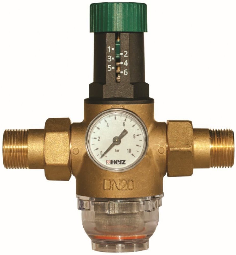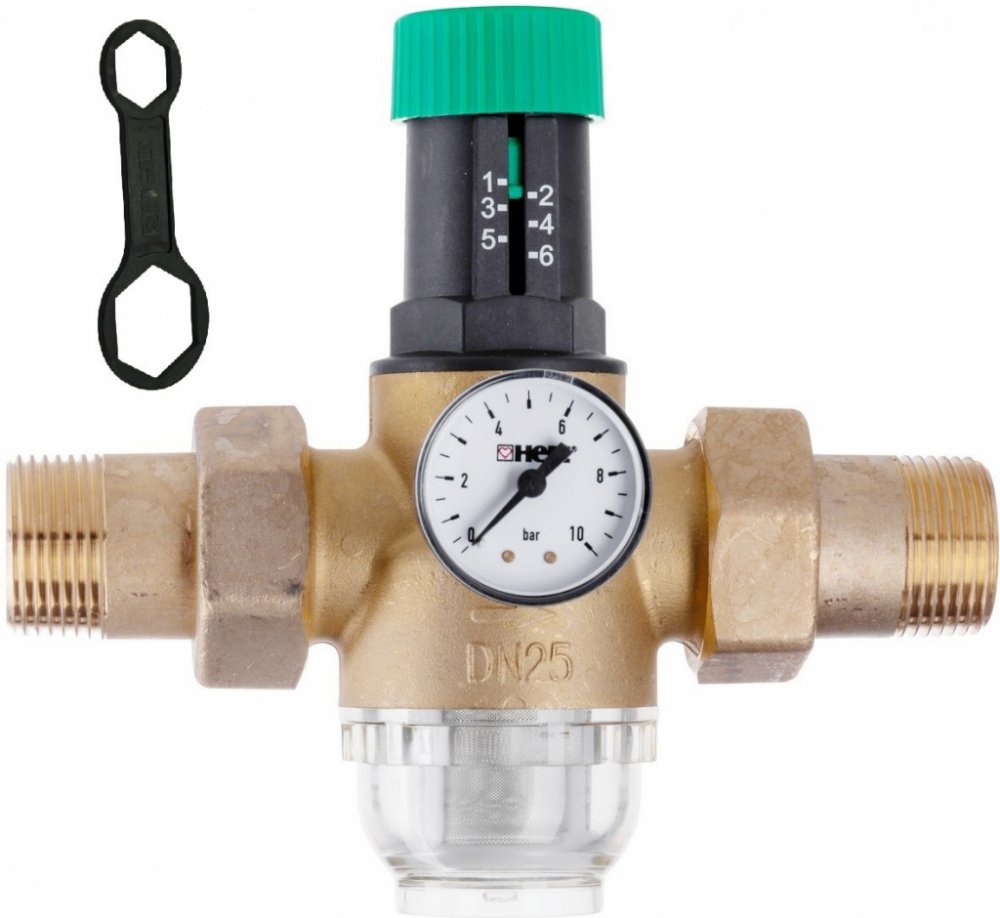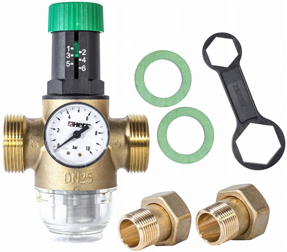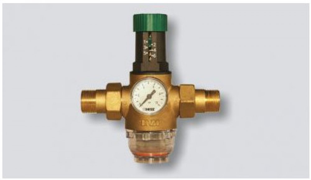 Membránový redukční ventil se používá v rozvodech pitné vody jako ochrana proti překročení provozního tlaku vody (snižuje vstupní tlak na úroveň pracovního tlaku). Výstupní tlak je nastavitelný a zůstává neměnný se změnami vstupního tlaku vody. Výstupní tlak nastavujeme otáčením zeleného ovladače. Otočením ovladače ve směru hodinových ručiček zvyšujeme tlak na výstupu. Doporučený max. výstupní tlak pro rozvody vody v objektech na bydlení je max. 4 bar. Nastavený výstupní tlak je odečitatelný na manometru, který je našroubován na přední straně ventilového tělesa. Údržbu ventilu smí provádět pouze odborně vyškolený personál dle DIN 1988. Filtr doporučujeme několikrát do roka zkontrolovat, v případě potřeby vyčistit nebo vyměnit. Montážní klíč pro demontáž banky s filtrem je součástí balení.