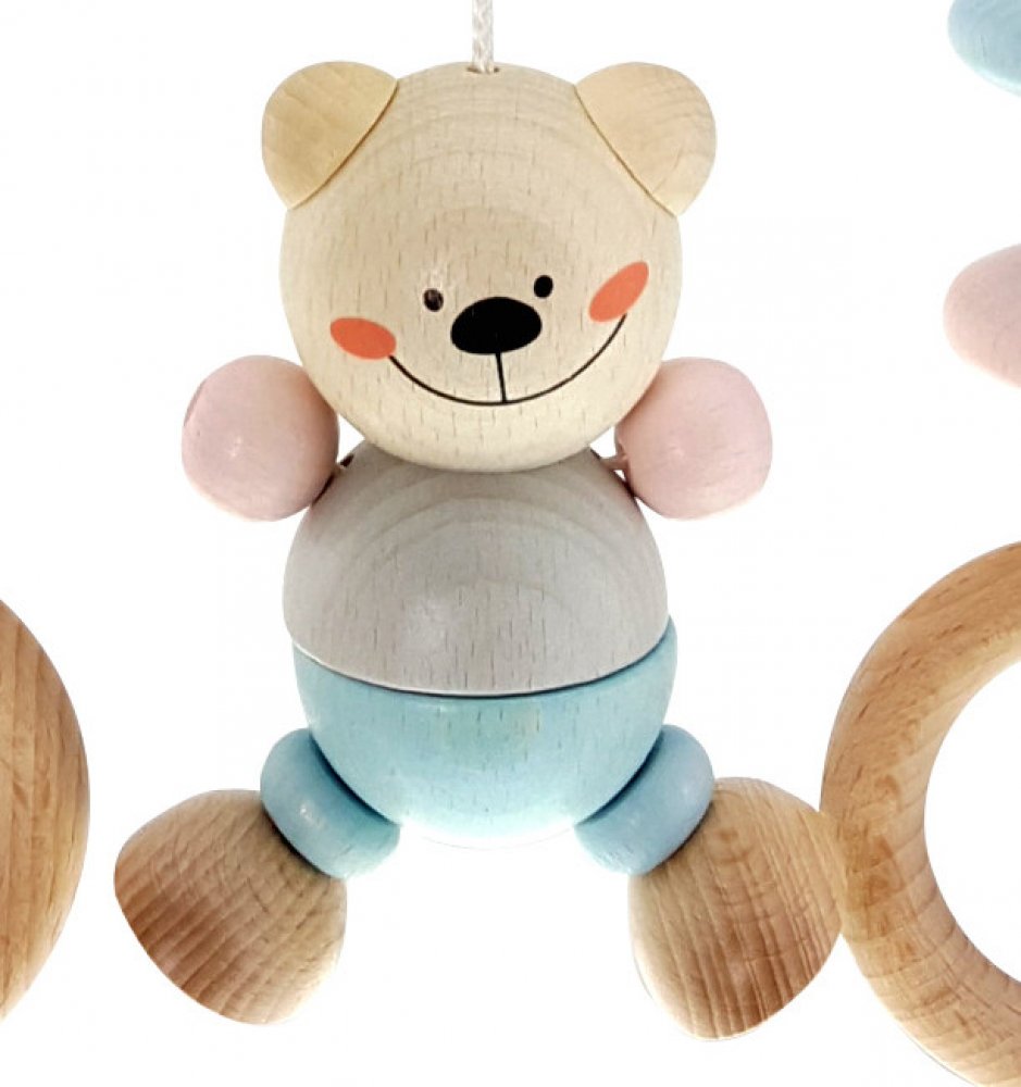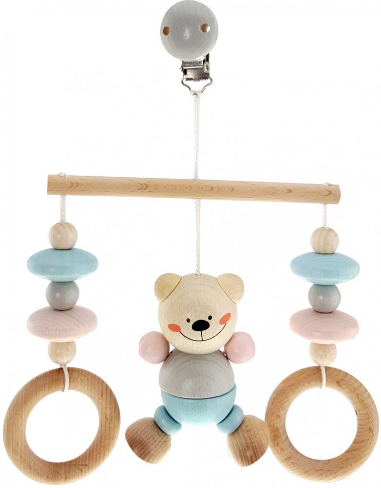 Dřevěná mini hrazdička s figurkou medvídka z bukového dřeva. Hlavní vlastnosti: trénuje senzomotorické dovednosti. lze připevnit na kočárek, nebo postýlku.