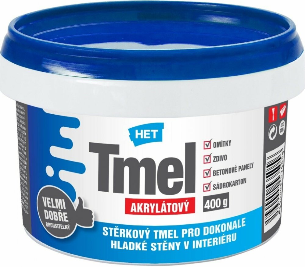 HET Bílý akrylátový stěrkový tmel na zeď je interiérový dokončovací vyrovnávací tmel pro plošné ruční nanášení na stavební materiály především minerální stěny. Používá se k vyrovnávání malých nerovností stěn (omítek, zdiva, panelů, sádrokartonu apod.) nebo k drobným vysprávkám. Tmel je připraven k okamžitému použití, má tixotropní charakter, je paropropustný, velmi dobře brousitelný a lze jím dosá...