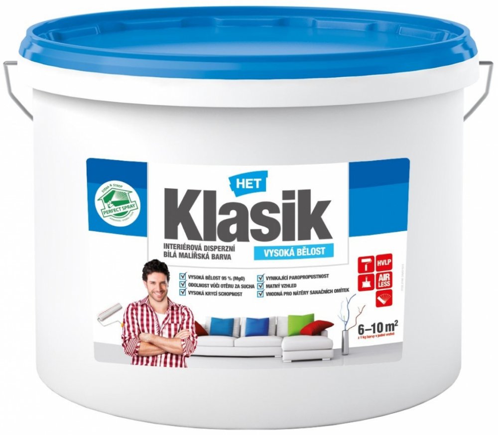 HET Klasik bílá malířská akrylátová barva na zeď je interiérová malířská barva určená k nátěrům stěn a stropů, vápenných, vápenocementových, sádrovápenných a sádrových omítek, sádrokartonových, sádrovláknitých a dřevovláknitých desek, omítek s akrylátovým pojivem, sanačních omítek (splňuje požadavek směrnice WTA CZ č. 2-9-04/D, tab. 4 limitující použití krycích vrstev na sanačních omítkách z hledi...
