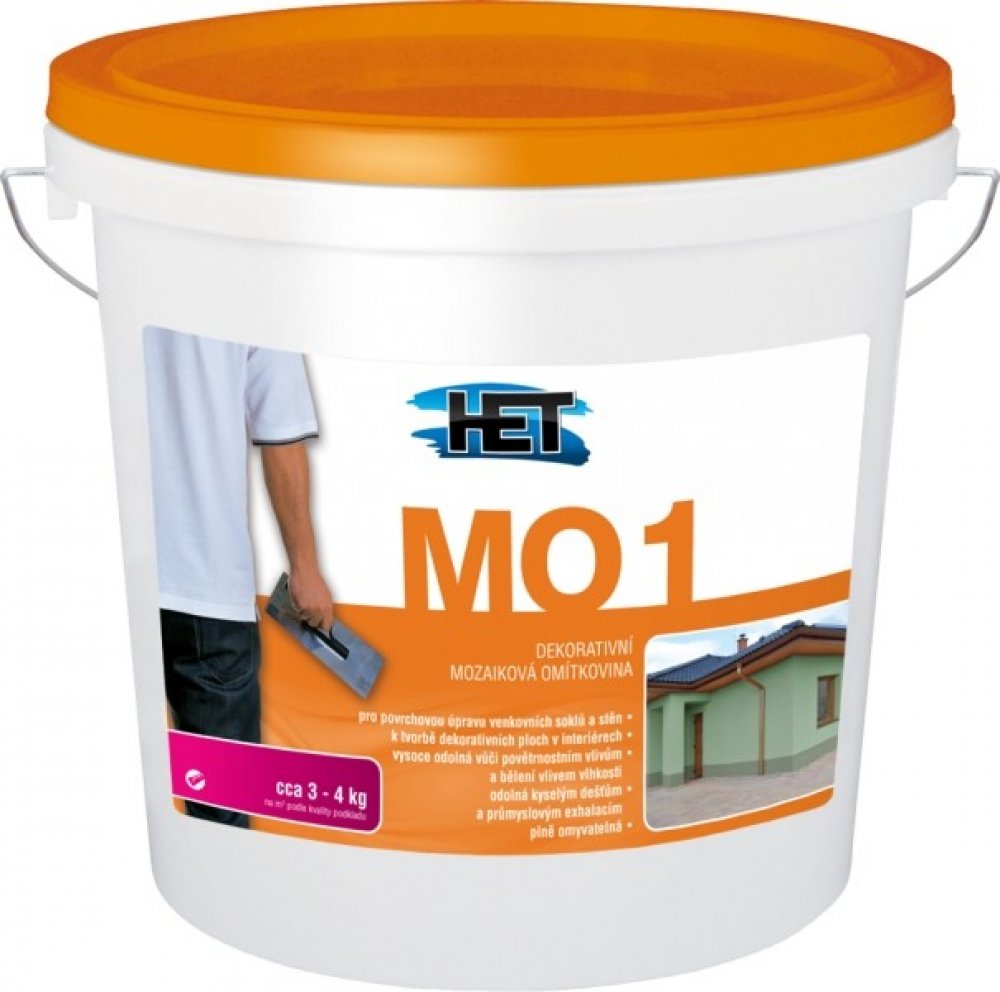 HET MO 1 omyvatelná dekorativní mozaiková omítka je dekorativní mozaiková omítkovina do venkovních i vnitřních prostor určená pro povrchovou úpravu svislých minerálních ploch, zejména venkovních soklů, stěn a k tvorbě dekorativních ploch v interiéru. Omítku lze v interiéru aplikovat také na sádrokartonové, dřevovláknité desky apod. Omítkovina je dodávána v pastovitém stavu, připravená pro přímé po...