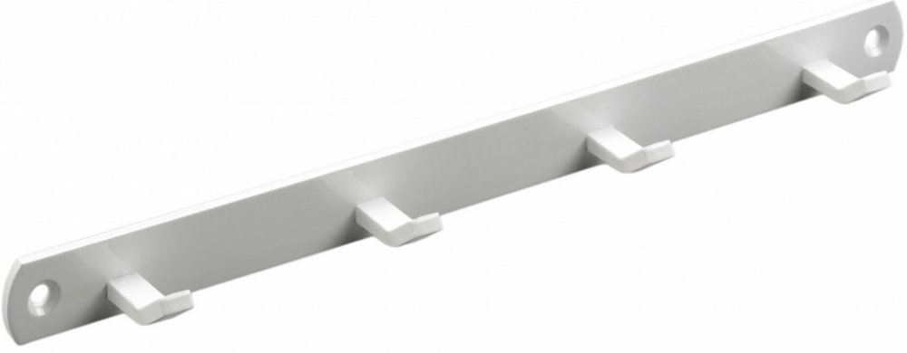 Bílá věšáková lišta se čtyřmi háky. Její rozměry jsou 20 mm x 270 mm x 23 mm.