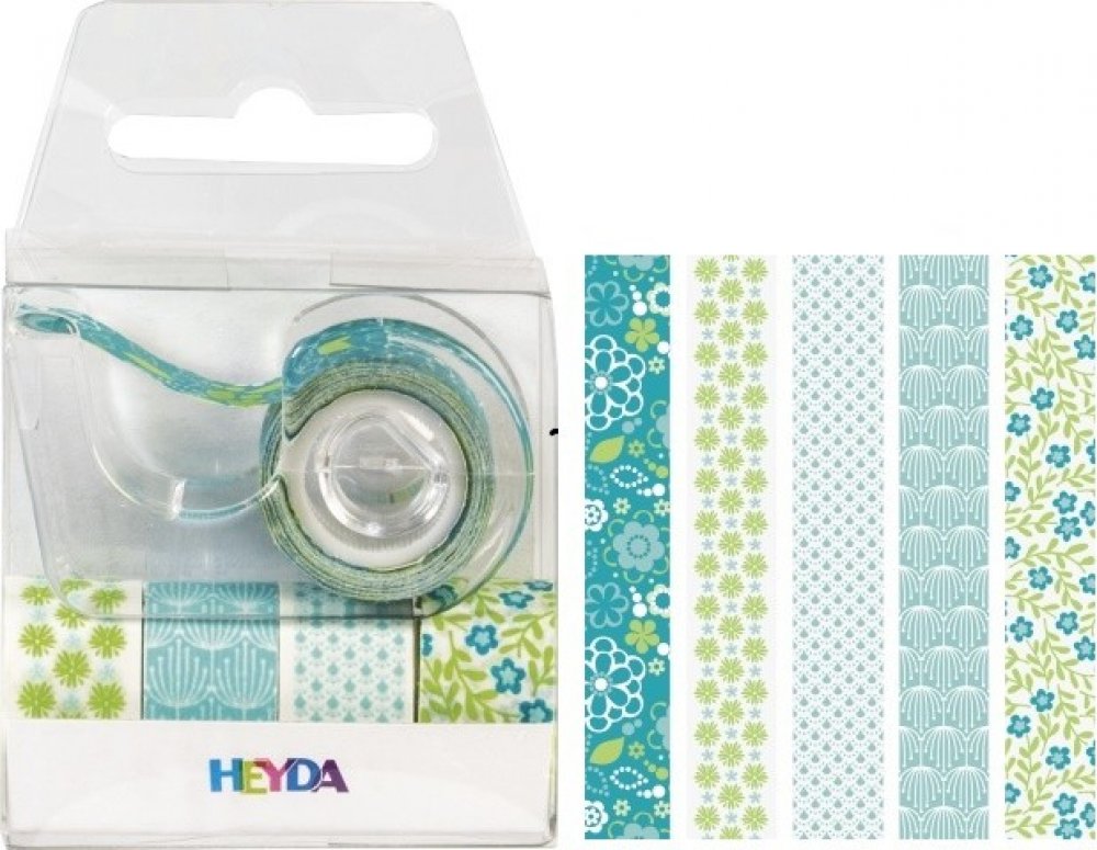 Dekorace pásky - 5 motivů bílá/zelená/tyrkys, šířka 1,2cm ,návin 3 m, součástí odvíječ pásky