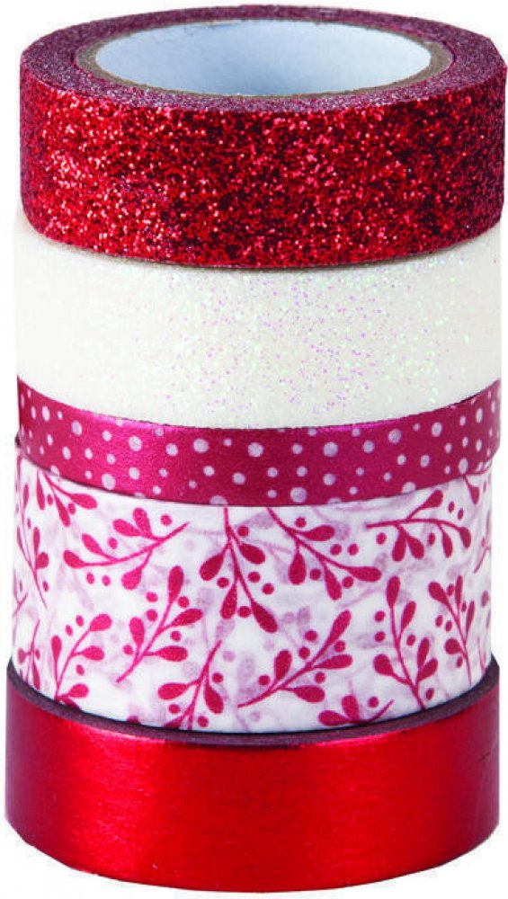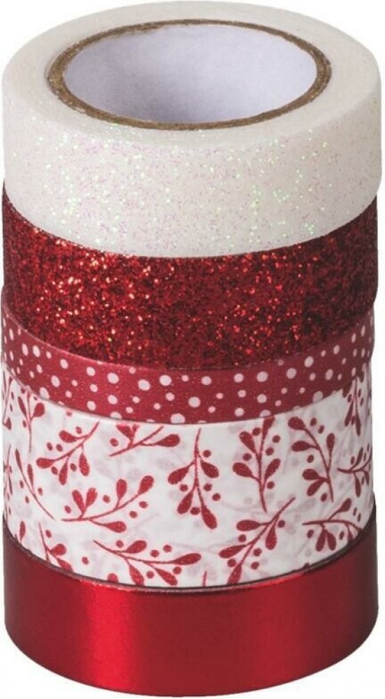 NELZE POSLAT V PLOCHÉ OBÁLCE!!! Samolepicí papírová páska dekorační. Balení obsahuje 5 rolí: třpytivá bílá 2m x 1,2cm, třpytivá červená 2m x 1,2cm, metalická červená 6,5m x 1,8cm, metalická červená 6,5m x 0,6cm, červená fólie 6,5m x 1,2cm.