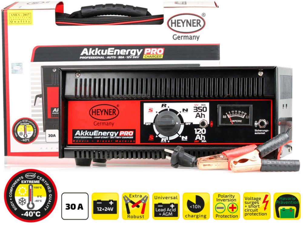 Profi nabíječka autobaterií od německé firmy Heyner.Specifikace: Efektivní nabíjecí proud: 30 Amper Napětí: 12/24V 30 - 350 AH Garantovaná mobilita - a to i při extrémních teplotách až do -40 ° C Univerzálně vhodné svorky baterie Kovové pouzdro s kvalitní izolací Certifikované zařízení - bezpečnost při přepólování a ochrana proti přetížení Ochrana proti zkratu Zkušební napětí, ochrana proti nadpro...