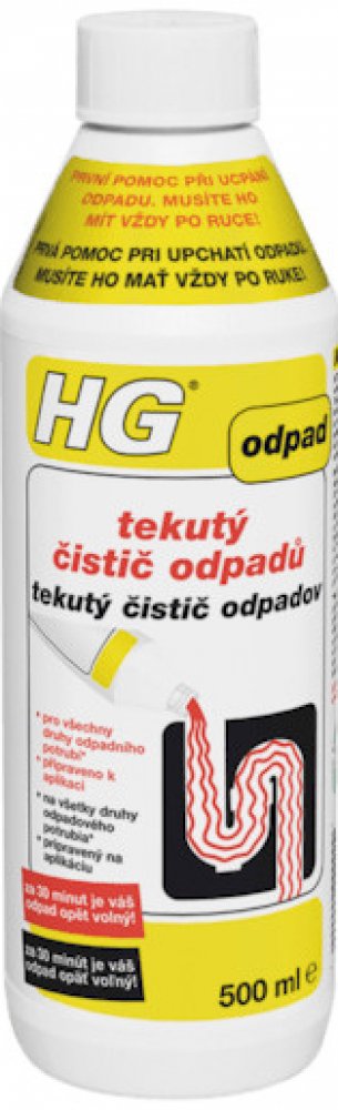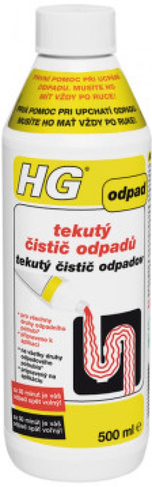 HG tekutý čistič odpadů je jedinečný, bezpečný, avšak velice silný čistič odpadů, který nabízí mnoho výhod. Tím, že je výrobek připraven přímo k použití, nemusíte ho ředit, takže riziko rozstřiku je menší. Výrobek nešumí ani nestříká, když ho lijete do odpadu. Mimoto, tento výrobek nemůže na rozdíl od zrnitých čističů odpadu, ucpání (zanesení) zhoršovat a nepoškozuje plastové odpadní trubky.