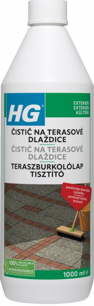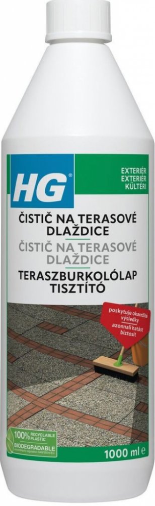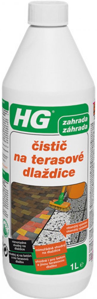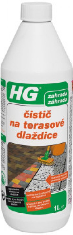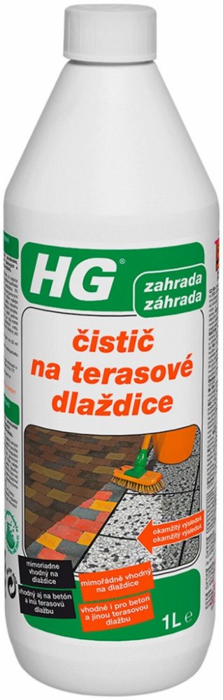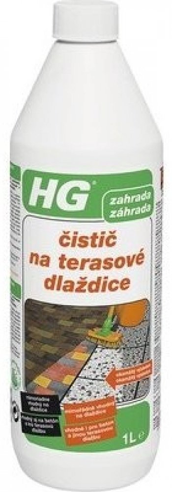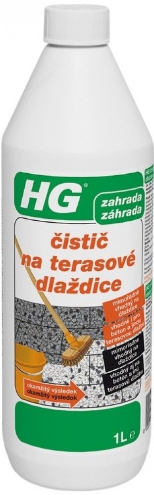 HG čistič na terasové dlaždice 1L Přípravek HG čistič na terasové dlaždice je silný koncentrovaný čistič speciálně vyvinut pro čištění špinavých a zašedlých štěrkových a betonových dlaždic. Dlažbu nejdříve dobře namočte, nezapomeňte na spáry. Kaluže vody odstraňte. Obsah láhve nařeïte s 4mi litry vody. Použijte větší nádobu, do které se vejde kartáč na tyči, například vanička na prádlo. Roztok nan...