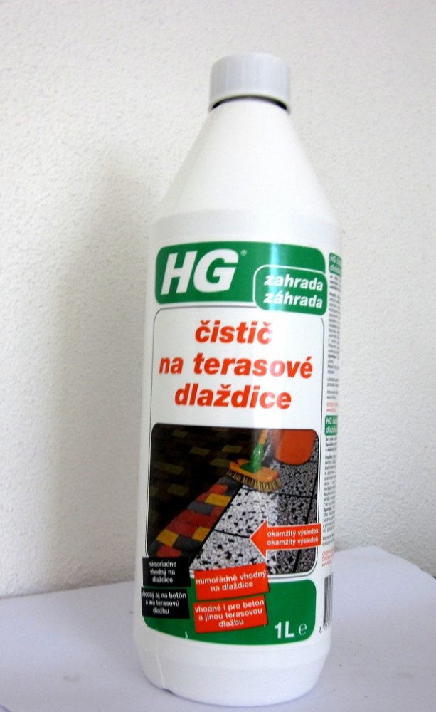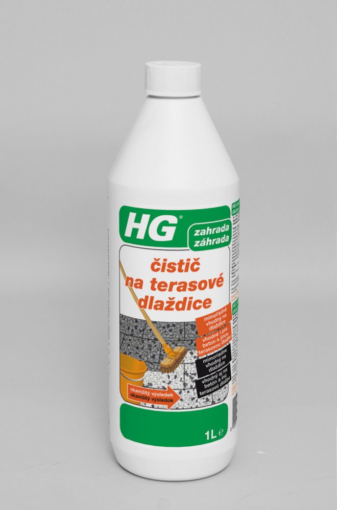 HG čistič na terasové dlaždice 1L Přípravek HG čistič na terasové dlaždice je silný koncentrovaný čistič speciálně vyvinut pro čištění špinavých a zašedlých štěrkových a betonových dlaždic. Dlažbu nejdříve dobře namočte, nezapomeňte na spáry. Kaluže vody odstraňte. Obsah láhve nařeïte s 4mi litry vody. Použijte větší nádobu, do které se vejde kartáč na tyči, například vanička na prádlo. Roztok nanášejte pomocí kartáče na dlažbu a dobře drhněte. Tekutinu nechejte nejdříve několik minut působit, poté znovu vykartáčujte a dříve než tekutina uschne dlažbu důkladně spláchněte vodou. čistí důkladně štěrkové dlaždice, betonové dlaždice a dlažbu, takže vaše terasa bude zase zářit jako nová! Vyčistěte terasu nejdříve přípravkem HG čistič na terasové dlaždice a poté ji ošetřete přípravkem HG odstraňovač zelených povlaků. Vaše terasa bude zářivě čistá a neobjeví se na ní několik měsíců zelený povlak. Velmi vhodné pro štěrkové dlaždice!