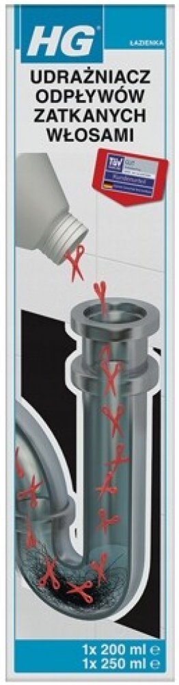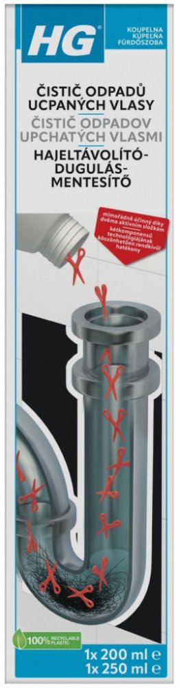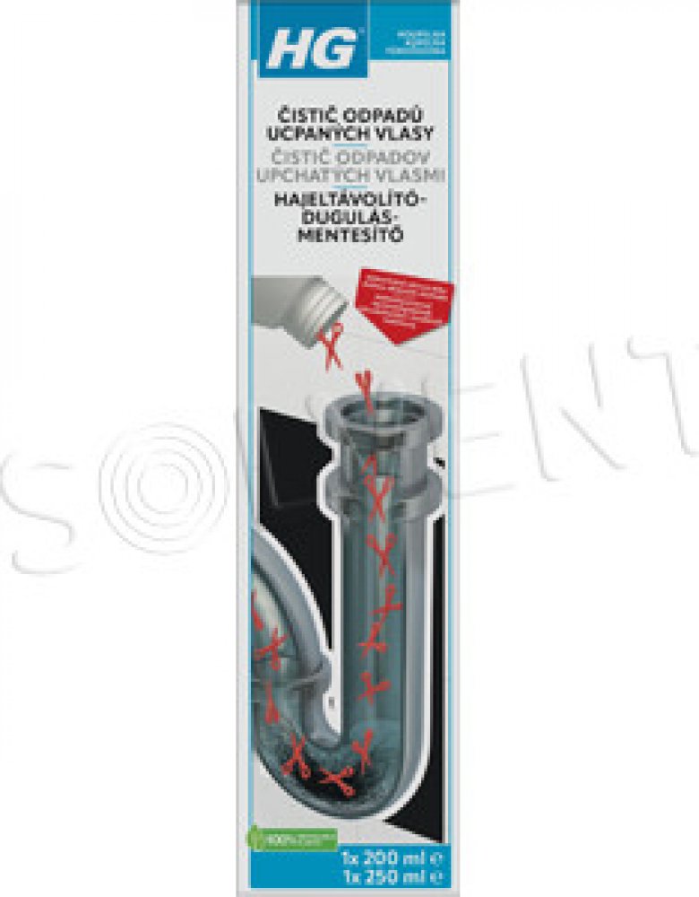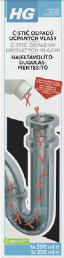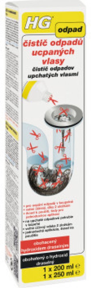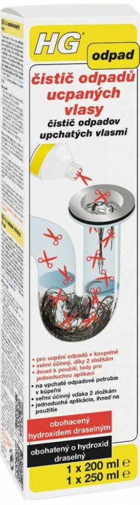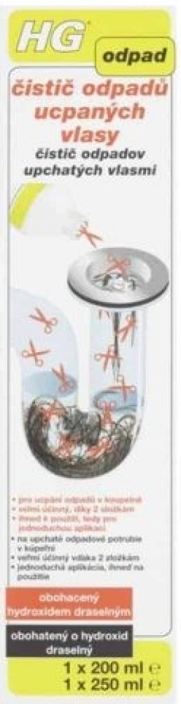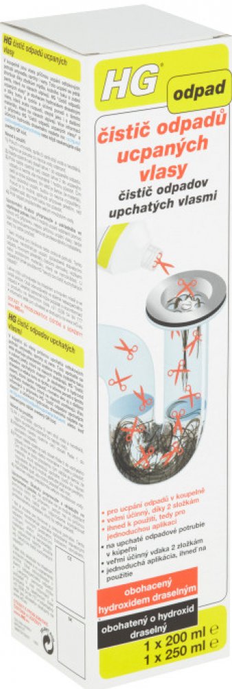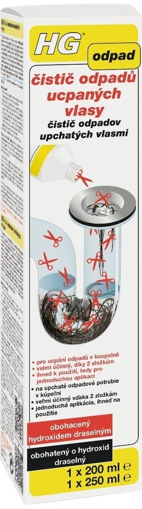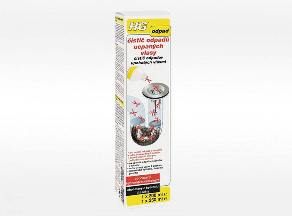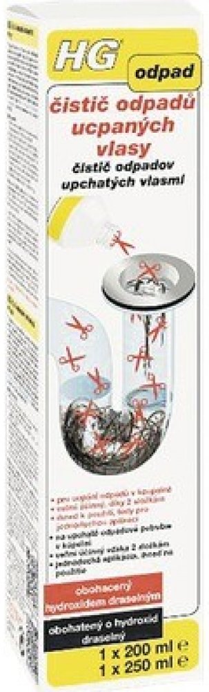 * HG "čistič odpadů ucpaných vlasy" je obohacen hydroxidem draselným a díky tomu si rychle a účinně poradí s těmito vlasy, které zcela rozpustí, stejně jako i s dalšími materiály, které na vlasech ulpívají.