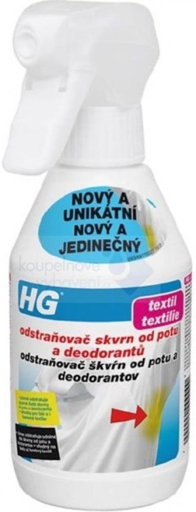 * HG odstraňovač skvrn od potu a deodorantů je účinným přípravkem pro odstranění žlutých skvrn z textilu v důsledku potu nebo deodorantů.
