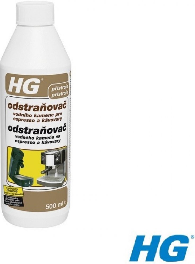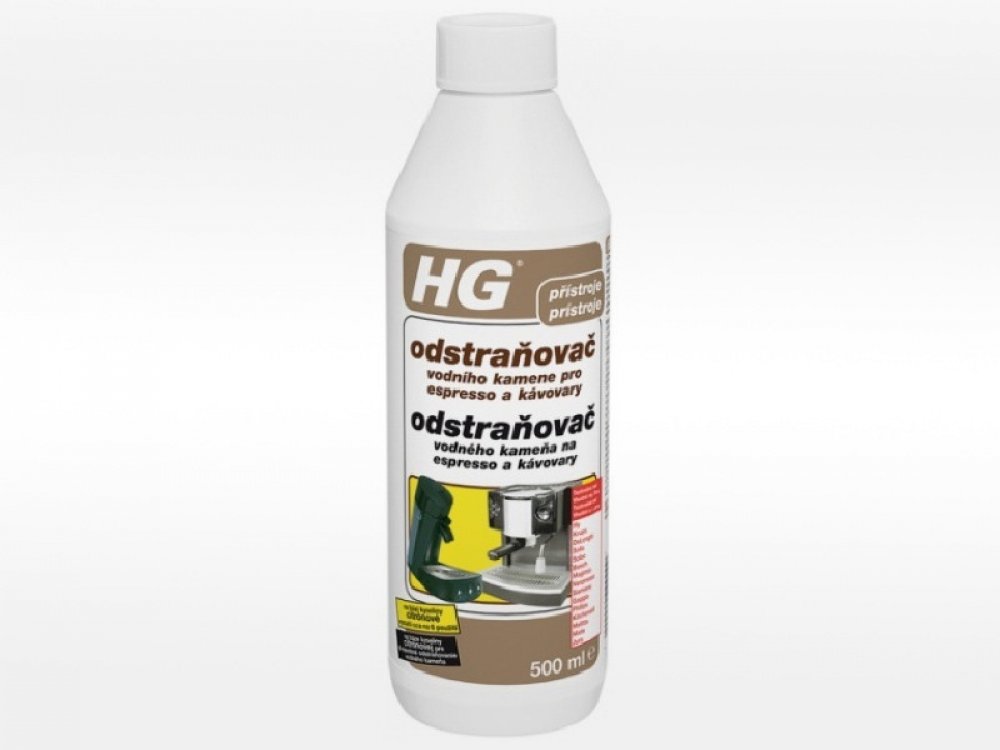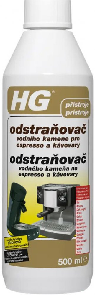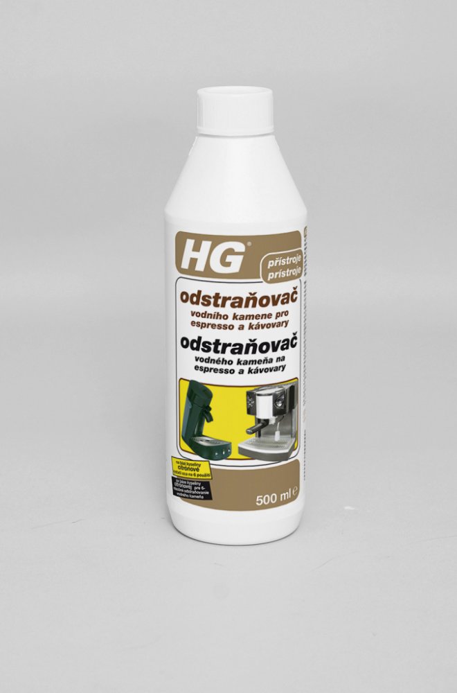 Nalijte 75 ml (3 kávového šálku) HG odstraňovače vodního kamene pro espresso a kávovary do nádržky na vodu a doplňte do 750 ml vodou (zředění 1:10). Nechejte roztok působit 10 minut. Poté přístroj zapněte a nechte kapalinu z poloviny protéci. Přístroj vypněte, nechte přípravek působit 10 minut a nechejte pak protéci zbytek kapaliny, až se nádržka zcela vyprázdní. Po ošetření přístroj řádně vypláchněte, poté ho naplňte čistou vodou z vodovodu a nechte minimálně 3× projet cyklus pouze s vodou, abyste odstranili veškeré zbytky vodního kamene a případnou pachuť. U přístrojů používajících kapsle vložte do držáku kapsle použitou kapsli, aby se do ní zachytily případné zbytky vodního kamene. Takto zabráníte možnému ucpání výtokového otvoru. Pro odvápnění běžných kávovarů, varných konvic a praček se doporučuje HG odstraňovač vodního kamene na spotřebiče.