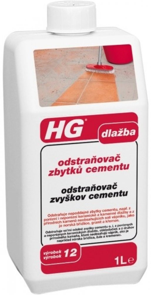 HG odstraňovač zbytků cementu a malty rozpouští silné povlaky cementu a zbytky malty a odstraňuje bílé výkvěty. Přípravek je vhodný především pro porézní a ne kluzké podlahy a zdi. Čištěnou dlažbu nejdříve namočte vodou. Poté pomoc kartáče na tyči naneste přípravek HG odstraňovač zbytků cementu a malty naředěný vodou. Nechejte chvíli působit, dobře vydrhněte kartáčem a čištěný povrch spláchněte vodou. 1 litr přípravku je dostatečný pro 15 až 35m2 plochy. Pro první mytí podlahy doporučujeme použít přípravek HG čistič slinuté dlažby pro odstranění posledních případných zbytků cementu.