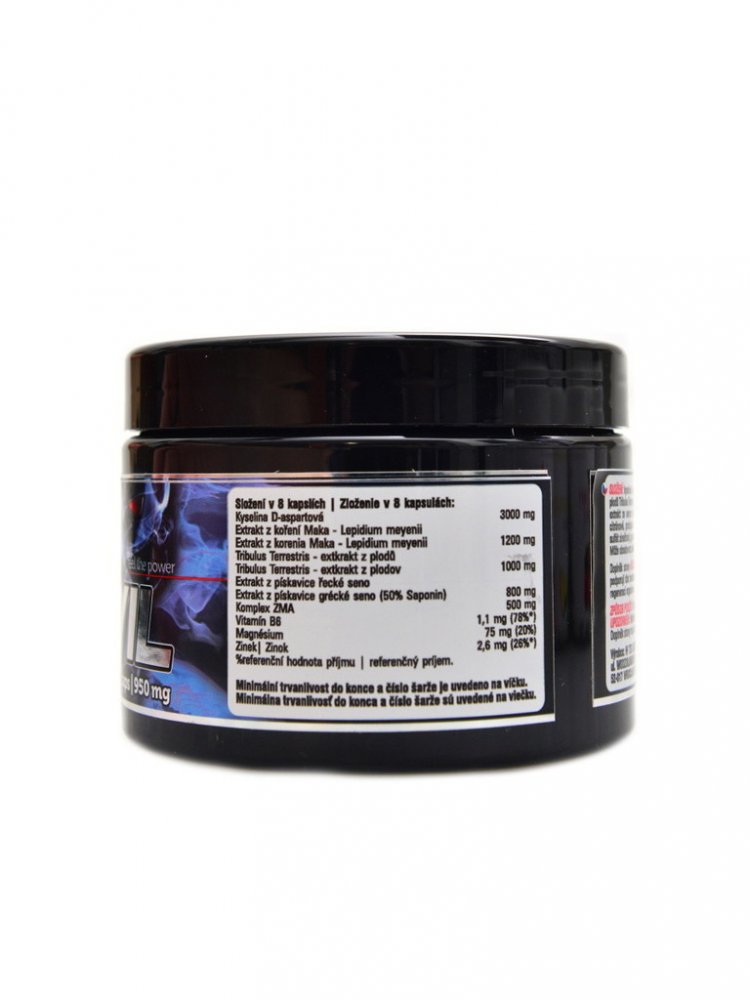Kyselina D-asparágová, extrakt z koření Maka - Lepidium meyenii, extrakt z plodů Trib. Terrestris, kapsle (obal kapsle - hovězí želatina, barvivo - oxid titaničitý), extrakt ze semen pískavice Trigonella foenum -graecum, hořečnaté soli kyseliny citrónové, protispékavá látka: hořečnaté soli mastných kyselin, mono-L-methionin sulfát zinečnatý, pyridoxin hydrochlorid.