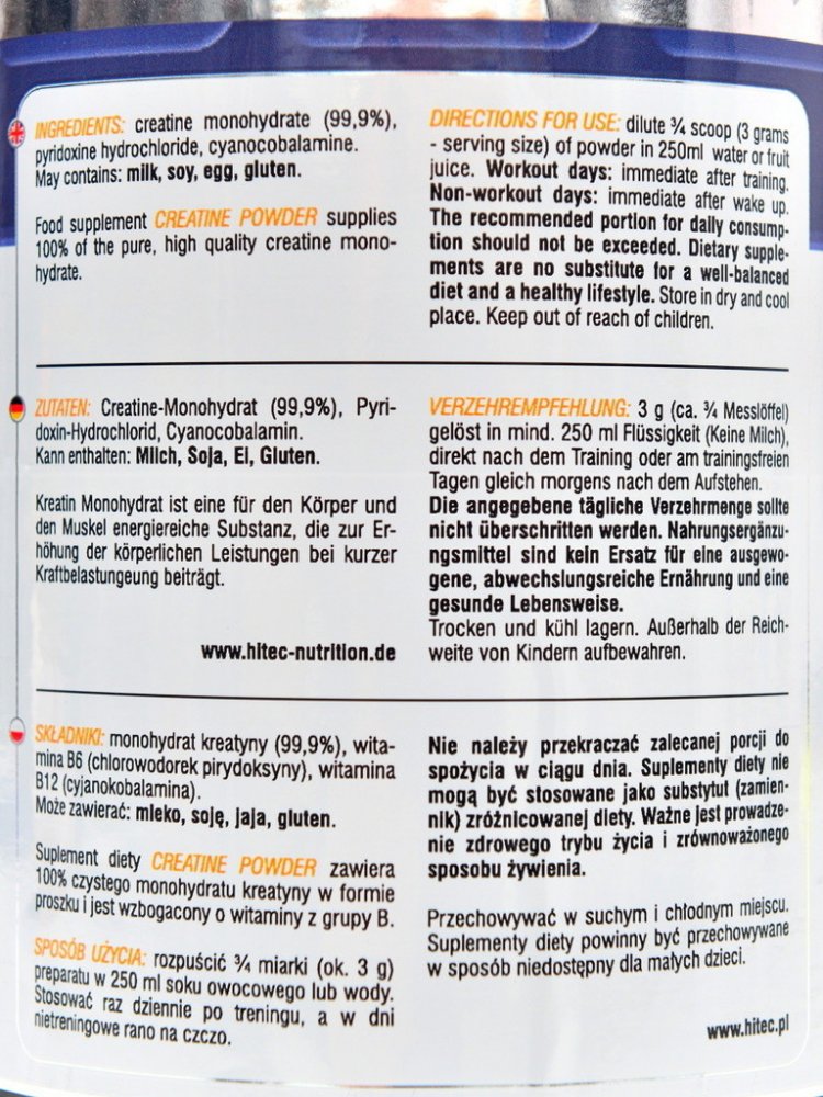 CREATINE POWDER je 100% čistý kreatin monohydrát ve formě prášku, obohacený o vitamíny skupiny B, nezbytné pro správný průběh metabolických procesů při zvýšené fyzické námaze. Suplementace kreatinem zvyšuje jeho intramuskulární koncentraci a tím i využitelnost ATP (zdroj energie).