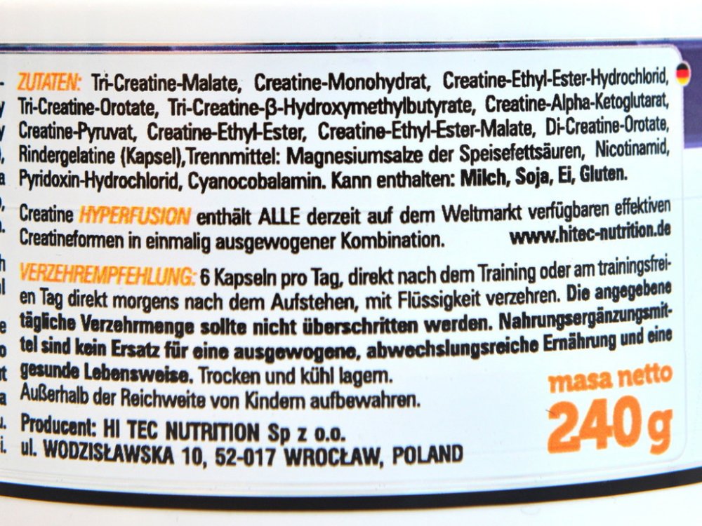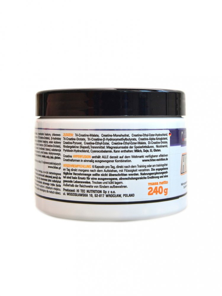 Kreatin rapidně zvyšuje svalovou sílu a objem svalů (natahuje do svalů vodu). Sportovcům pomáhá rychle zlepšit fyzickou kondici a nabrat svalovou hmotu. Ulehčuje přizpůsobení organismu fyzické námaze a posiluje anabolické procesy ve svalové tkáni. HYPER FUSION má také silný antikatabolický účinek a neutralizuje zakyselení svalů.