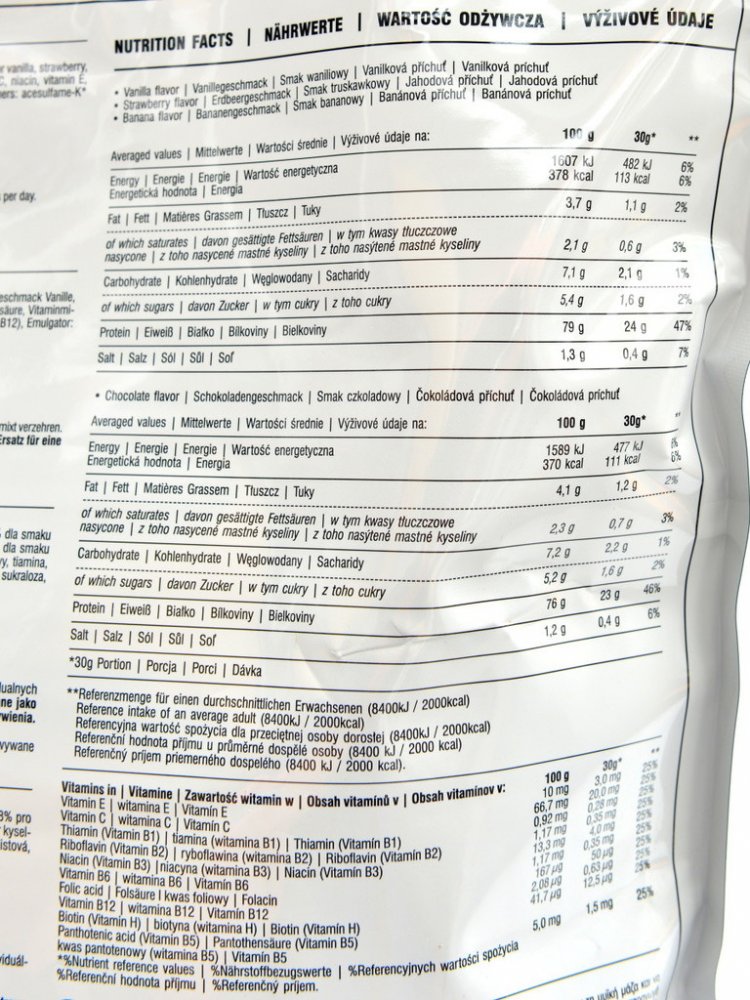Proteinová směs skládající se z koncentrátů syrovátkových bílkovin, mléčných bílkovin ( kaseinu ) a pšeničných bílkovin. (98% pro vanilkovou, jahodou, banánovou příchuť a 93% pro čokoládovou příchuť ) kakaový prášek se sníženým obsahem tuku, (3% pro čokoládovou příchuť ), aroma, regulátor kyselosti: kyselina citronová a askorbová, niacin, DL Alfa tokoferol acetát, D pantothenát vápennatý, thiymin mononitrát, riboflavin, pyridoxin hydrochlorid, D-biotin, kyselina listová, kyanokobalamin, emulgátor lecitin, sladidla Acesulfam K, sukraloza, extrakt z červené řepy pro jahodovou příchuť.