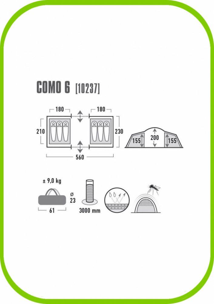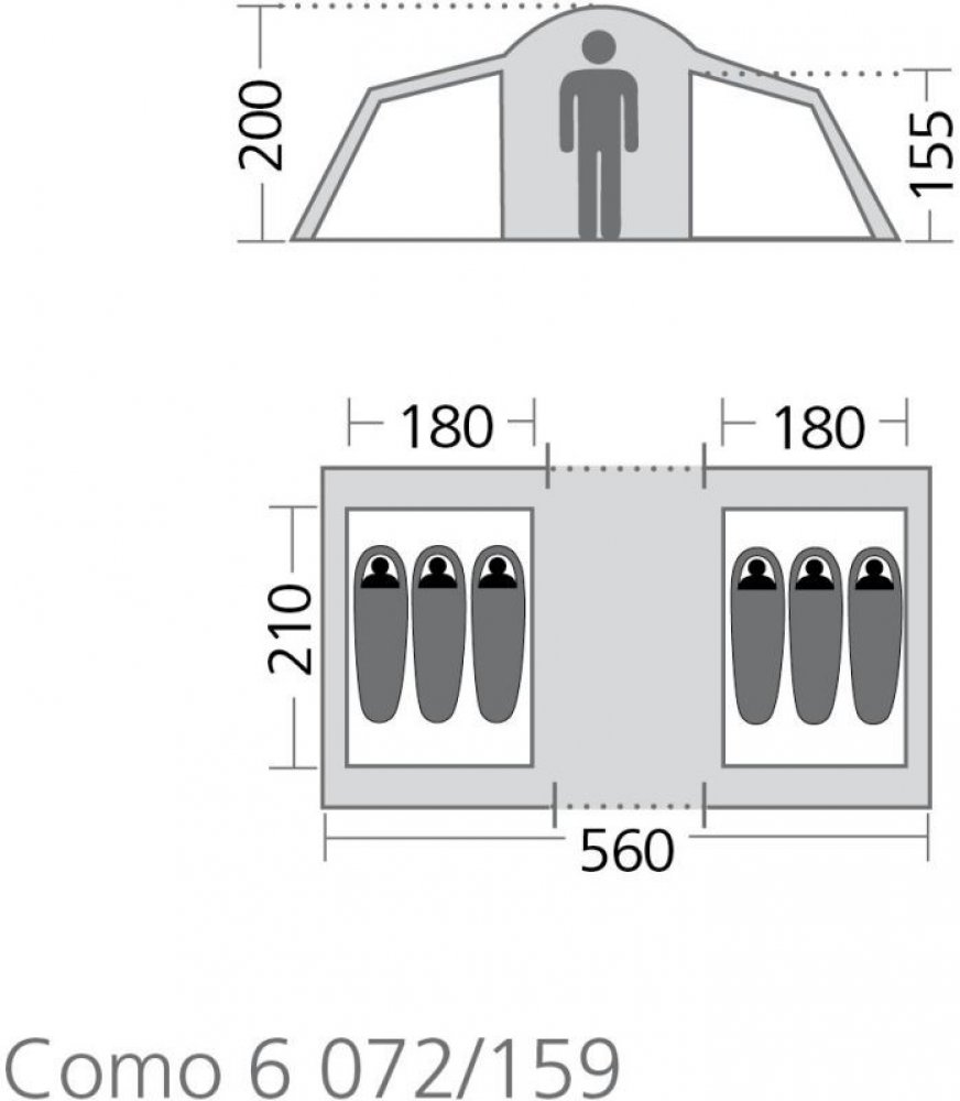 Rodinný stan Como se 2 ložnicemi je vyroben z kvalitního vysoce voděodolného materiálu s podlepenými švy. Dvouplášťová konstrukce umožňuje ložnici izolovat od vnější konstrukce stanu. Proudění vzduchu mezi stěnami ložnice a plachtou zabraňuje prochladnutí ložnice. Větrací otvory. Sklolaminátový rám je odolný a velmi rychle se rozkládá a skládá. Stan je zabalen v obalu.