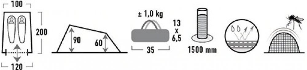 1 kg 200 cm 1500 mm 120 cm 90 cm 2 1 High Peak turistické s jednou ložnicí áčkové