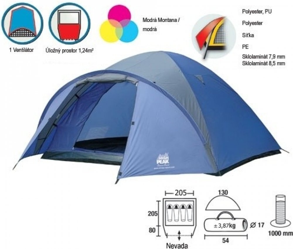 Outdoorový stan High Peak NEVADA 3.0 je třímístný, dvouplášťový, kopulovitý stan ideální pro vaše výlety do přírody. Stan poskytne mnoho důležitého prostoru a zároveň vás ochrání před vlhkostí díky vodnímu sloupci a lepeným švům. Vchod je chráněn prodyšnou moskytiérou a lzejej stočit a uchytit ke straně. Stan nabízí také vnitřní kapsy nebo držák na lampu. Má dvě stálé odvětrávání s nastavitelnou vzdáleností otevření. Je vybaven ochranným faktorem UV 80, který dostatečně chrání proti UV záření a snižuje vnitřní teplotu stanu. Díky dokonalému systému Vario Vent Control, který se dá variabilně ovládat zevnitř stanu a v závislosti na počasí si ho lze pohodlně korigovat spouštěním krycí plachty. Pokud je zavřený celý systém Vario Vent Control, cirkulaci vzduchu zajišťují dva další systémy kontinuálního větrání. Tmavé prostředí uvnitř stanu vám umožní prodloužit pocit noci pro lepší spánek.