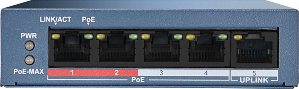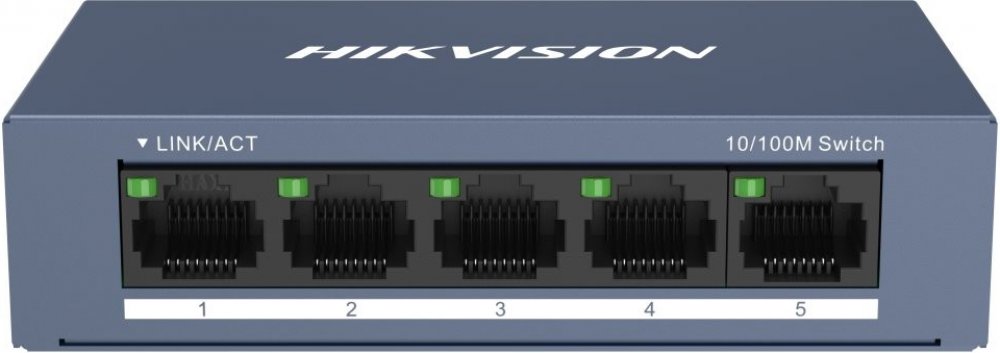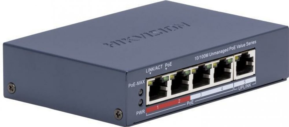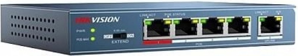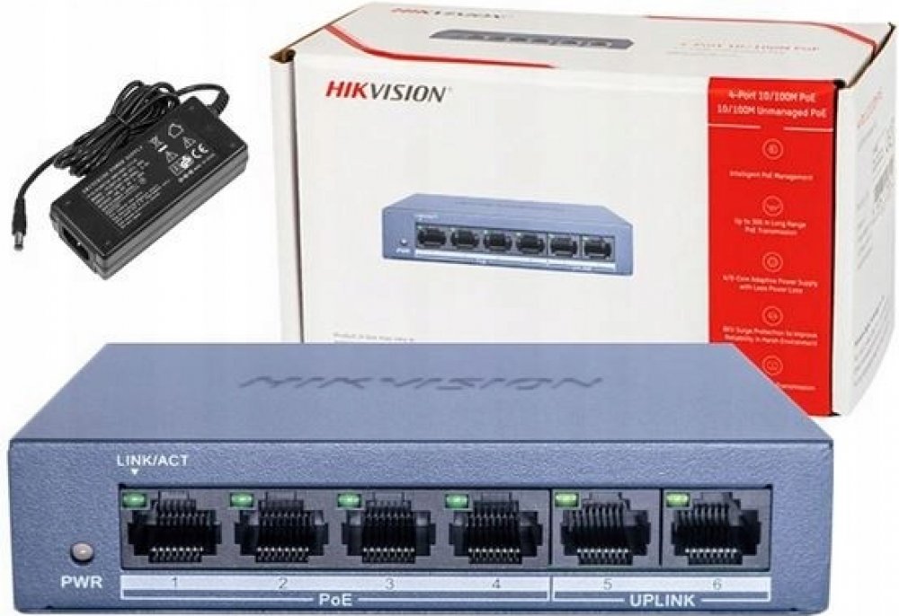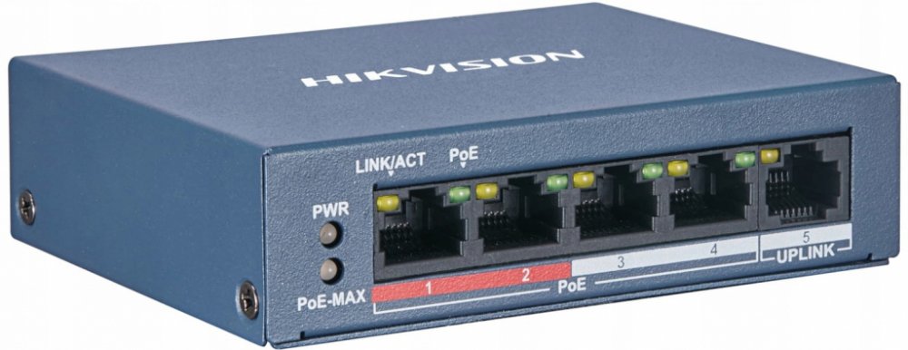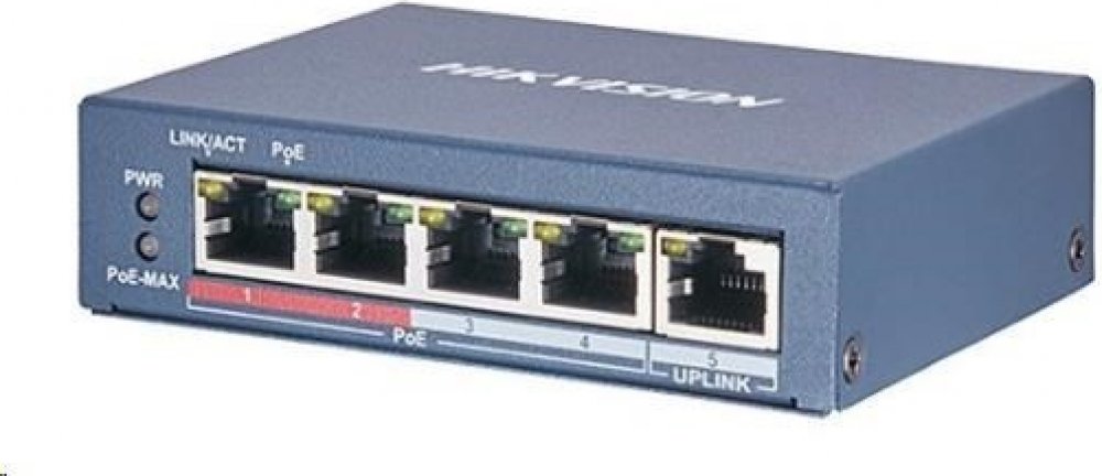 DS-3E0105P-E/M(B) Hikvision je přepínač pro budování malých IP dohledových systémů. Má 5 portů Fast Ethernet, z nichž 4 mohou poskytovat napájení PoE (802.3af/at) IP kamerám, z nichž první dva porty mají vysokou prioritu.