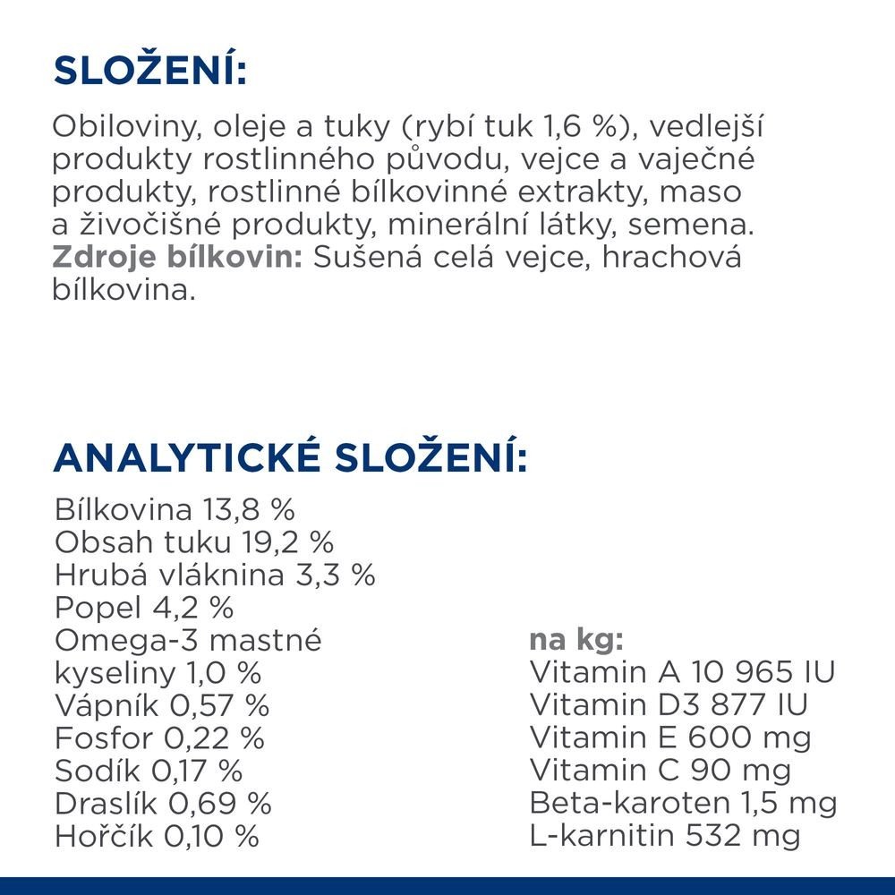 Originál: kukuřice, pivovarská rýže, sušená celá vejce, živočišný tuk, hrachová bílkovina, sušená řepná dužina, pšenice, proteinový hydrolyzát, sójový olej, minerální látky, rybí tuk, lněné semínko, L-karnitin, vitamíny, stopové prvky a beta-karoten. S přírodními antioxidanty (směs tokoferolů).